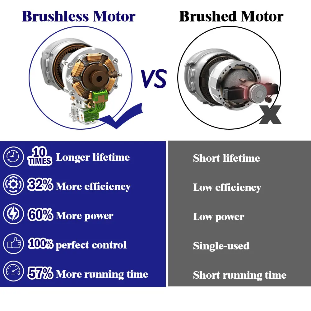 -Бесщеточный двигатель не генерирует искры, когда он работает, и двигатель не изнашивается.
