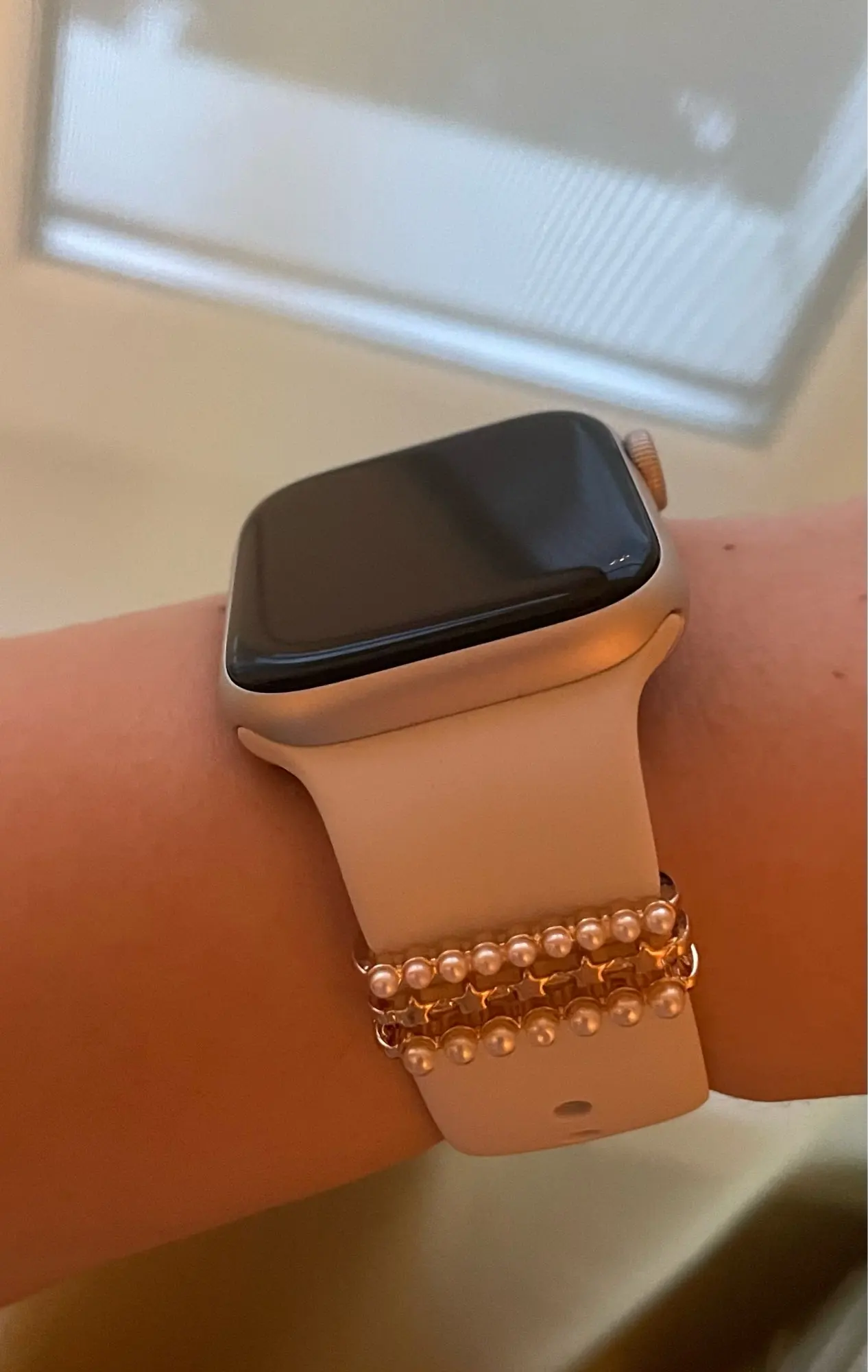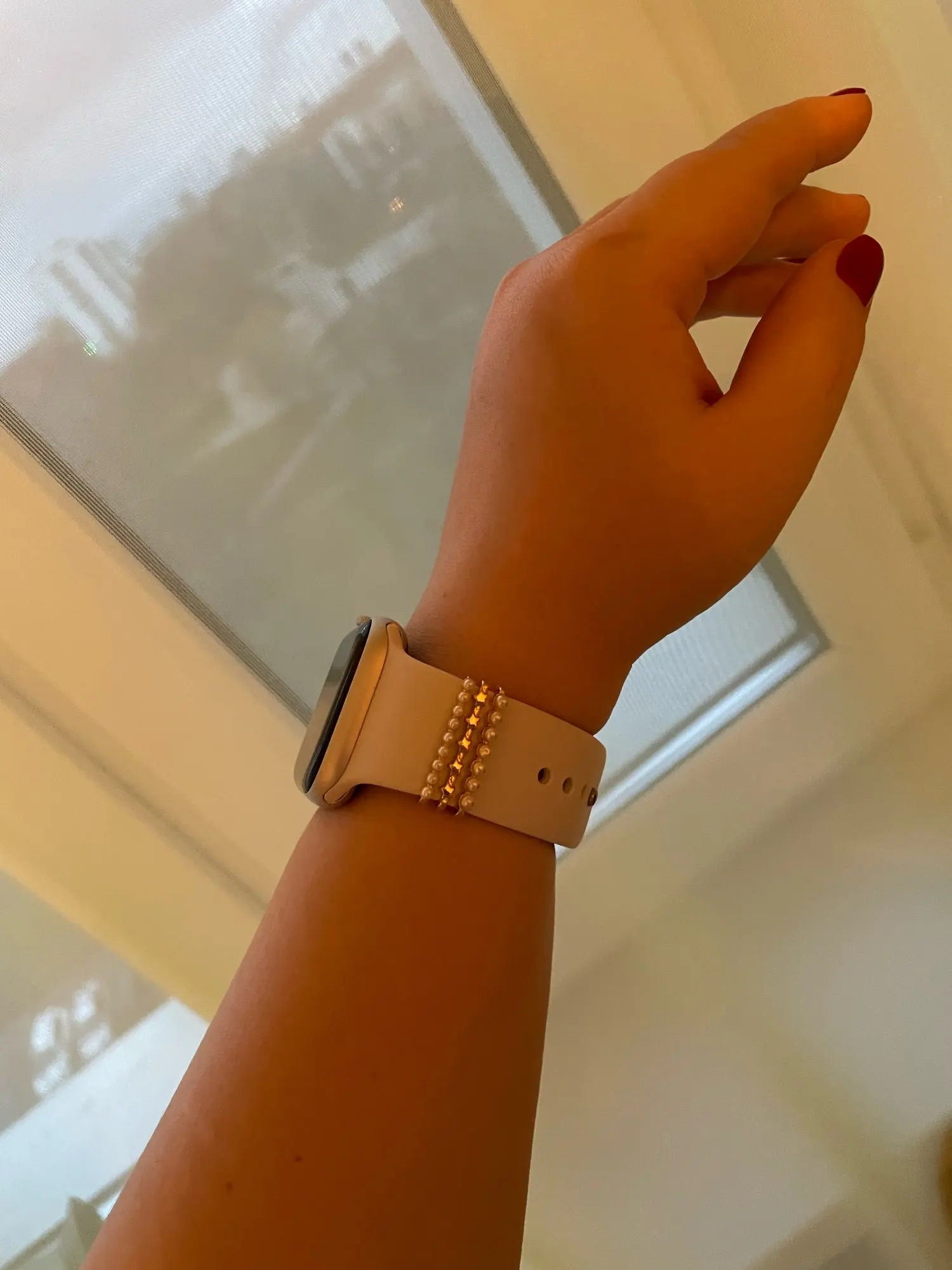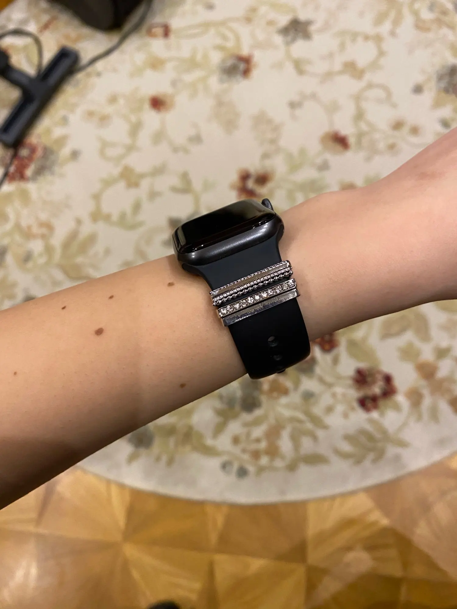 Интересные браслеты для ремешка. Качество за эти деньги вполне достойное, сияют на свету. На 38-40мм сидит плотно, немного двигается, если задевает одежда. Надевать их можно только со дырочек силиконового ремешка, на другой не получится, из-за застежки. К покупке рекомендую, шло долго, чуть больше месяца, но это уже вопрос к Почте России. Отслеживание упрощенное, на территории России не отслеживалось, только факт прибытия в страну, а затем только в отделение для вручения. Надевать полный комплект браслетов не хочется, слишком много, на мой взгляд.