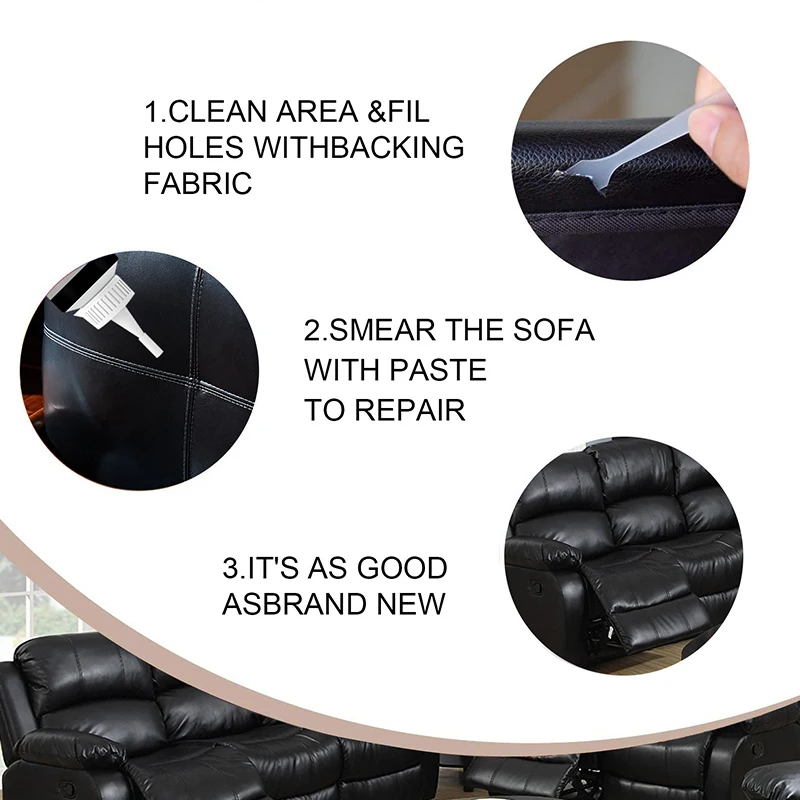 1. Limpie y desengrase la superfcie a reparar2. Aplique el cuero liquido con una espacula, extendiéndolo uniformemente3. Espere a que la superficie se seque o use un secador de pelo4. Reparla reparación esta completa!