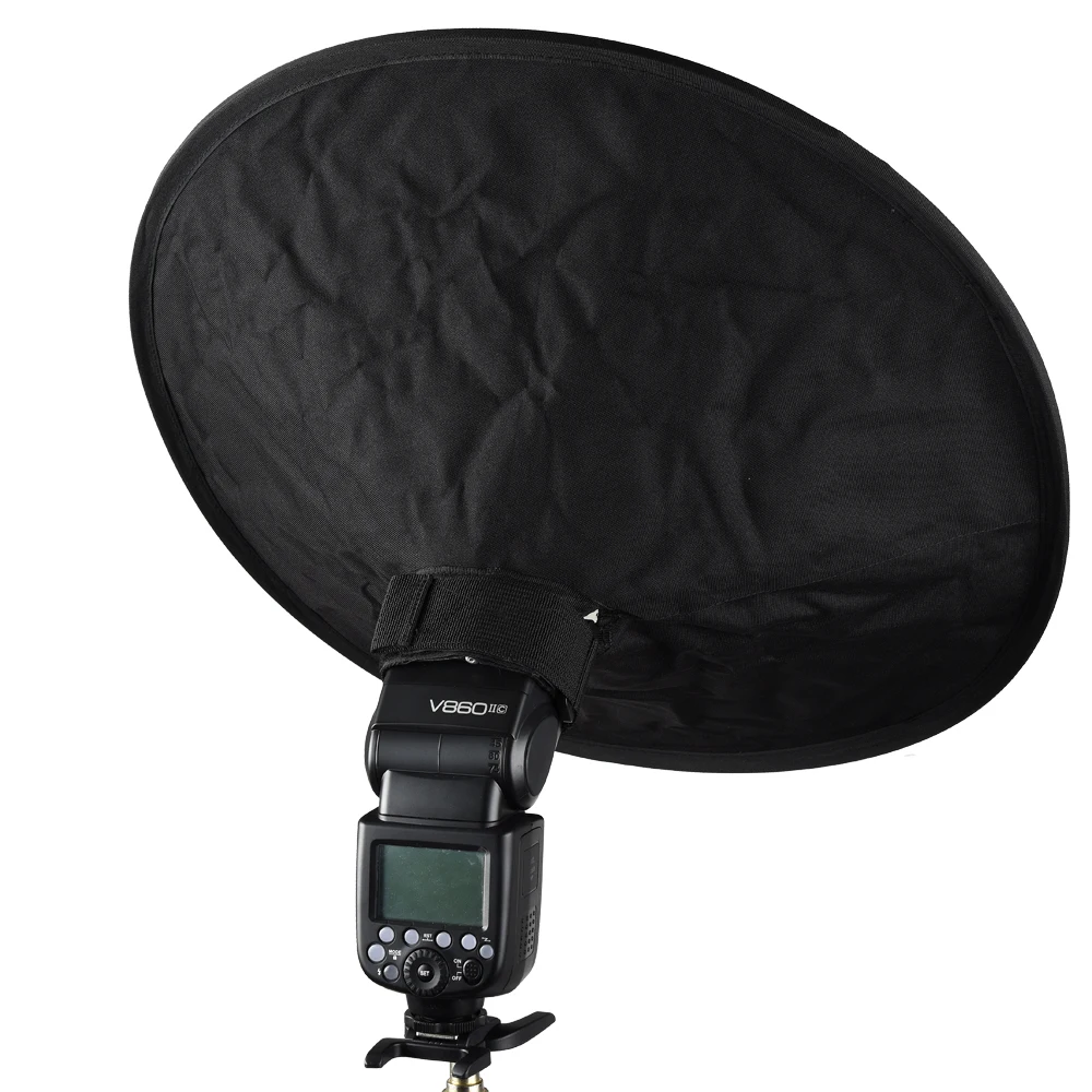 -Используйте регулируемый ремешок на липучке, чтобы прикрепить складной софтбокс к вспышке горячего башмака.