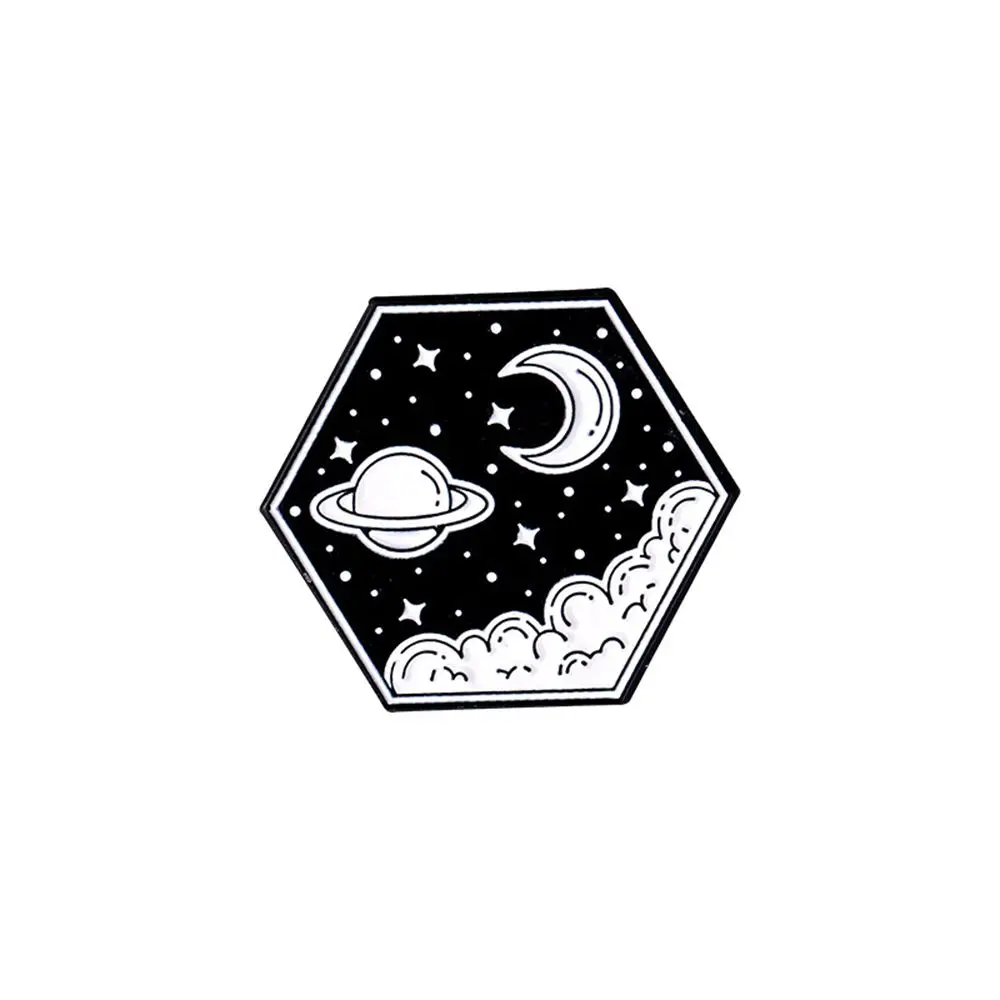Черно-белая мультяшная брошь на лацкан с изображением пейзажа космо...