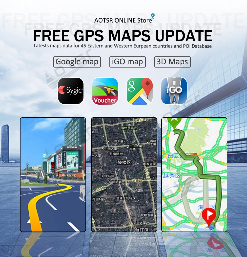 Поддержка онлайн и офлайн-приложений navi, таких как Google map, igo map, поддержка 3D карт и голосовых указаний. Мы предлагаем бесплатное пожизненное обновление карт. (поддержка воспроизведения радио/Bluetooth/USB/SD во время навигации.)Последние карты данных для 45 стран Восточной и Западной Европы и базы данных POI.Примечание: У нас также есть GPS карты для США, Канады, Израиля, Австралии, Новой Зеландии, ОАЭ и африканских стран.
