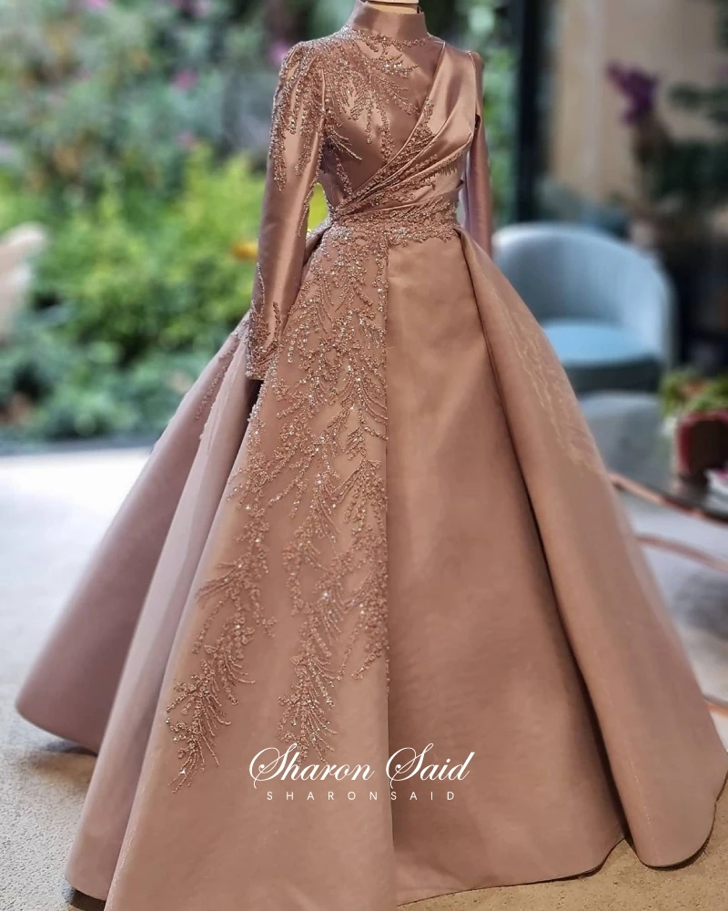 Роскошное вечернее платье Дубай розового цвета в мусульманском стиле для женщин Свадебные Элегантные платья с высоким воротом и длинным рукавом цвета слоновой кости арабские свадебные платья