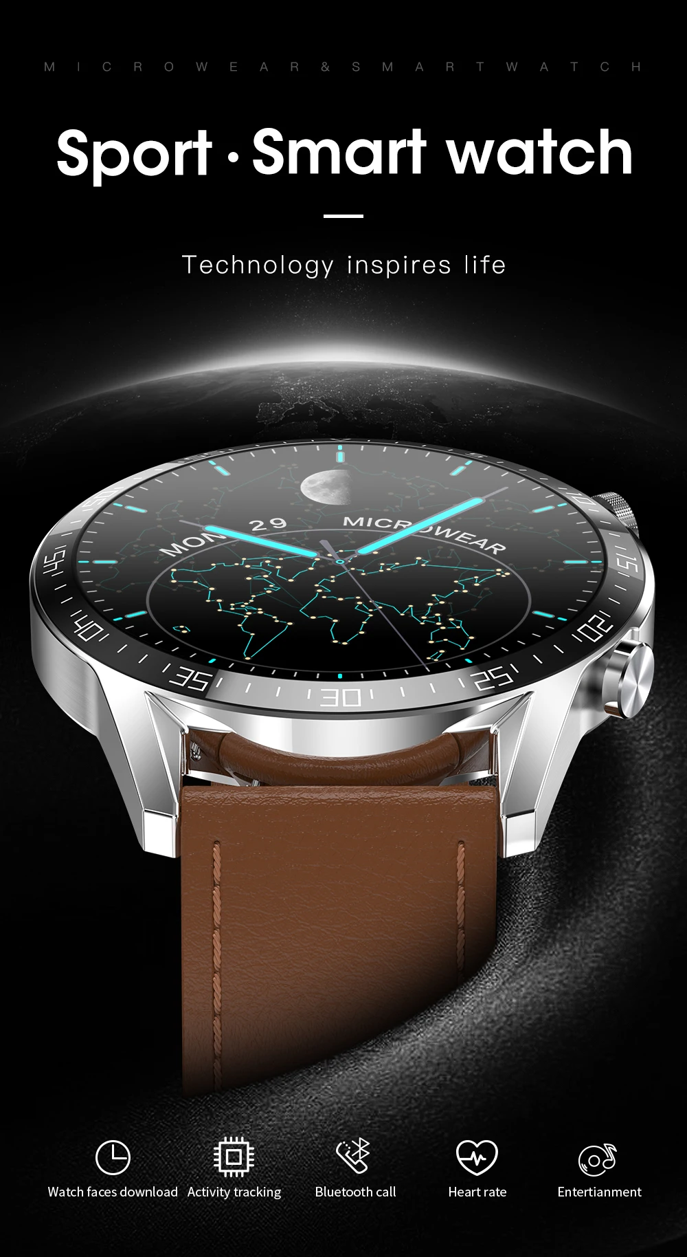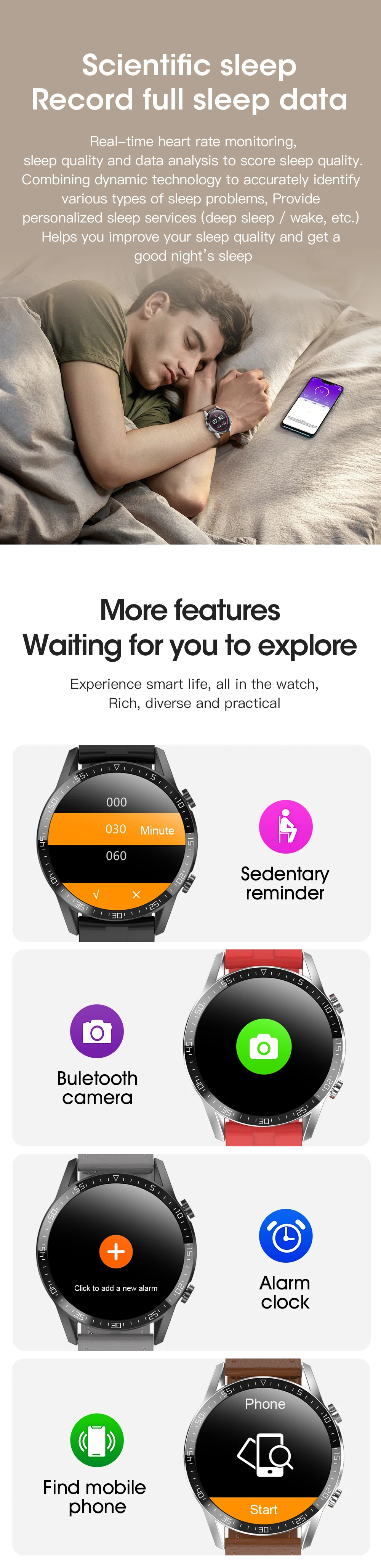 1. Следите за своим здоровьем:Монитор сердечного ритма, напоминание о сидячем положении, трекер сна.2. Хороший помощник для тренировки:Шагомер, сожженные калории, расстояние, спортивные режимы.3. Хороший помощник для повседневной жизни:Bluetooth телефонные звонки, пользовательские лица, несколько циферблатов часов, Bluetooth музыка, синхронизация уведомлений, анти-потеря, Синхронизация контактов со смартфона, камеры дистанционного управления, будильник, календарь, секундомер, калькулятор и т. Д.