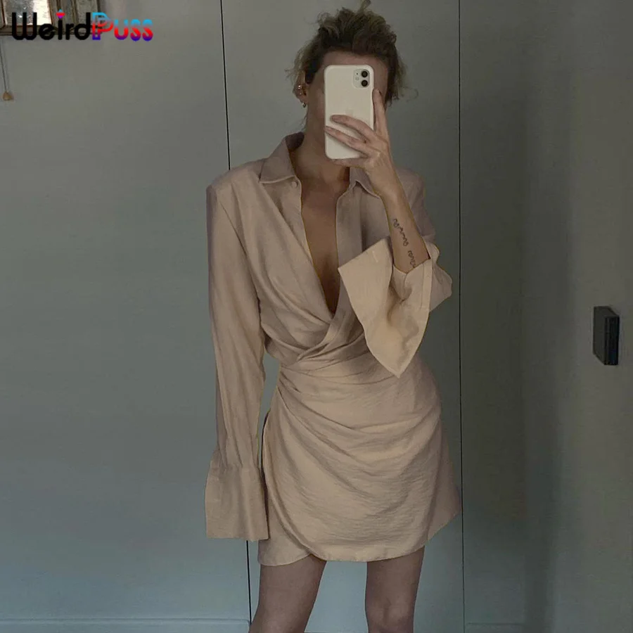 Женское платье с рюшами, длинным рукавом и глубоким вырезом