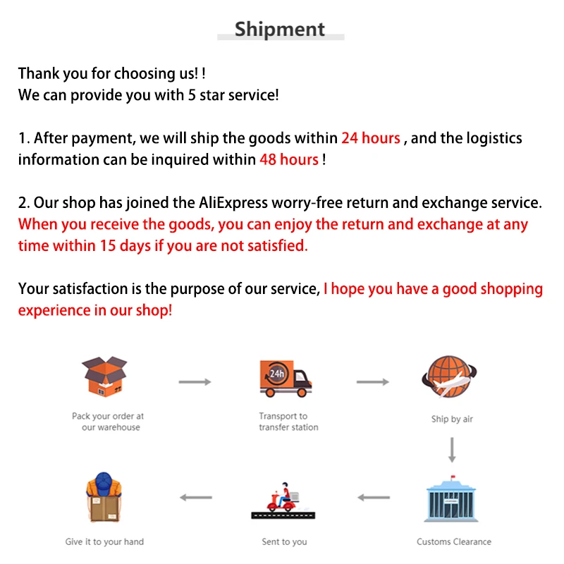 1. После оплаты, мы отправим товар в течение 24 часов, и Логистическая информация может быть запрошена в течение 48 часов! 2. Наш магазин подключился к AliExpress беззаботному возврату и обмену. Когда вы получаете товар, если вы не удовлетворены, вы можете вернуть или обменять его в любое время в течение 15 дней.