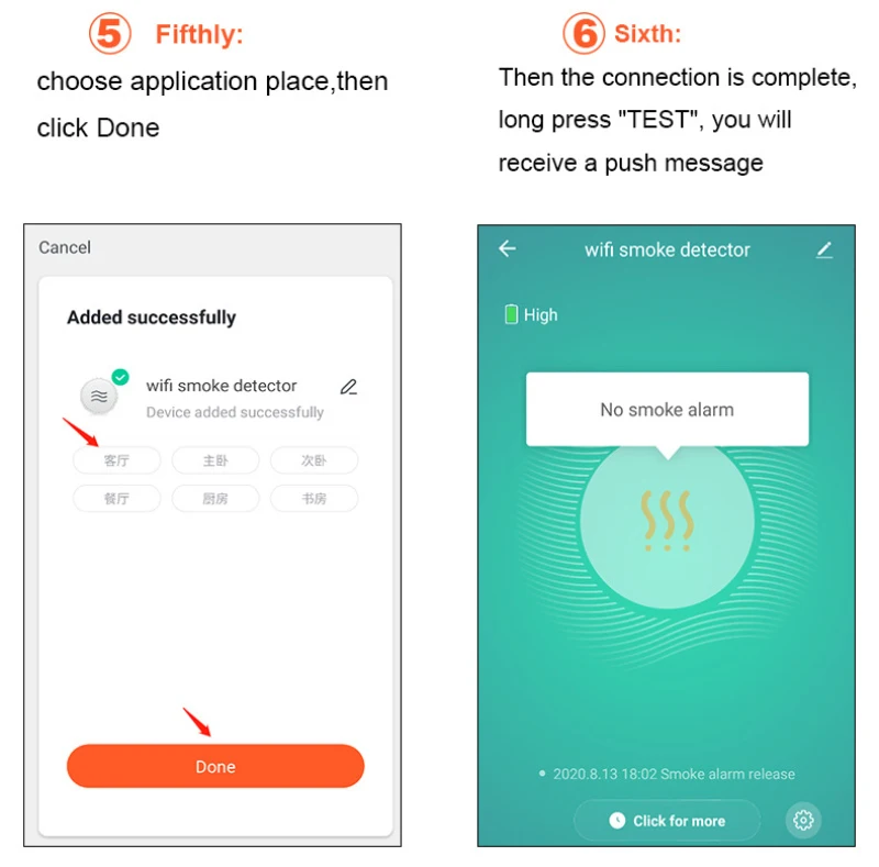 При обнаружении дыма и пожаров, звуковой сигнал до 85 дБ будет выдан с красным миганием светодиодный светильник и отправлен в мобильное приложение для защиты безопасности всей семьи.