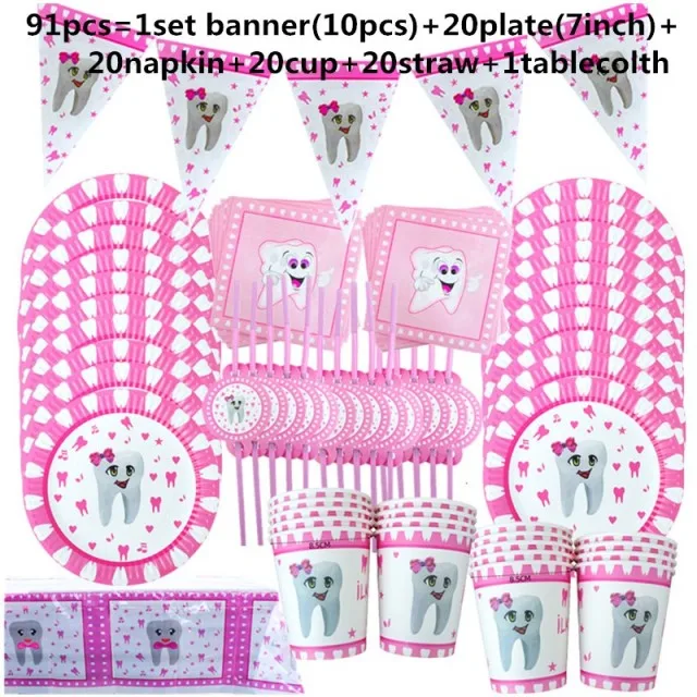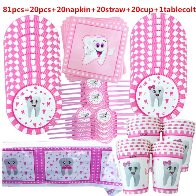 89 шт. розовые зубы для первого дня рождения девочки баннер с первыми зубами тарелки чашка попкорн шляпа одноразовая посуда детский душ Dec