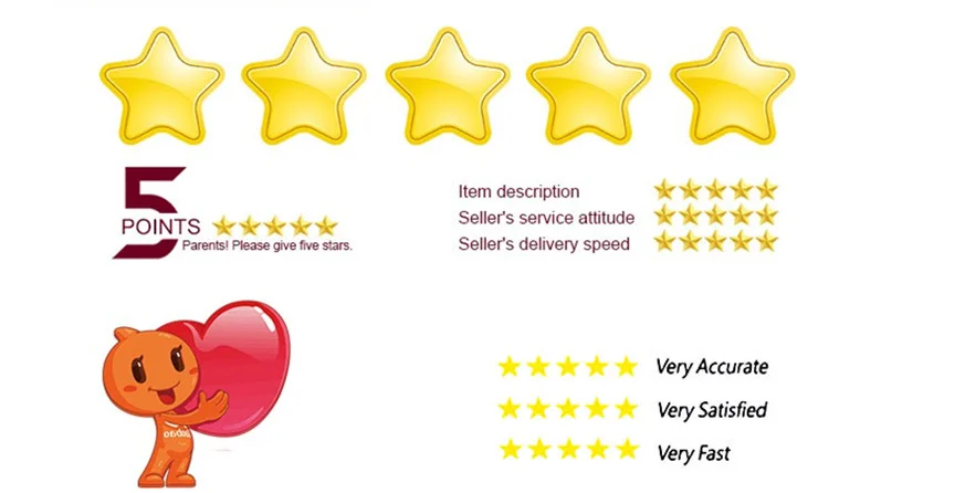 1. Мы всегда предлагаем высококачественные продукты и услуги. Ваши отзывы очень важны для нас, поэтому, пожалуйста, уделите несколько секунд, чтобы оставить нам положительный отзывы (5 звезд), если вы удовлетворены нашей продукцией и обслуживанием.
