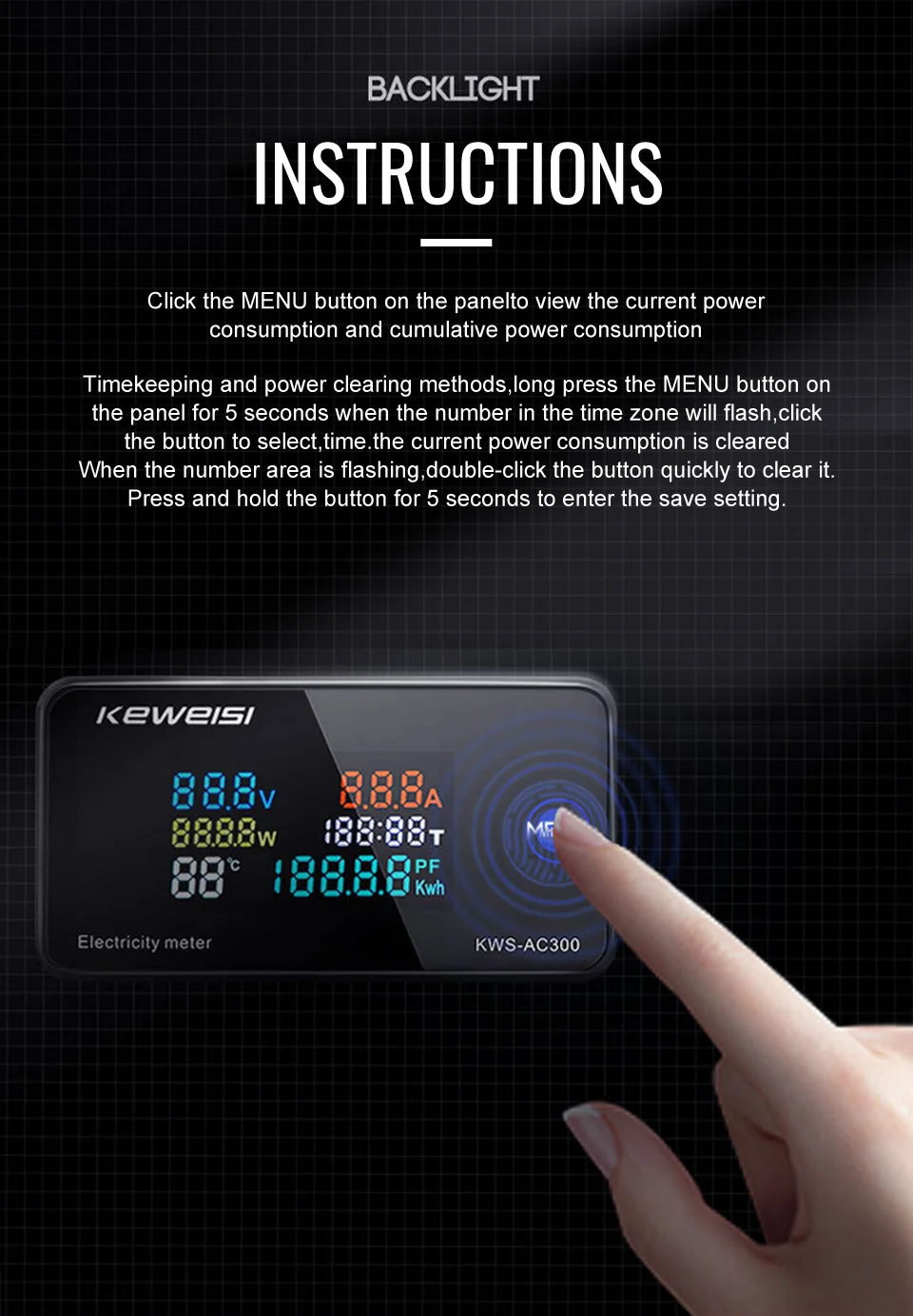 Нажмите кнопку меню на панели для просмотра текущей электрической энергии. Метод сброса электрической энергии и времени: Нажмите и удерживайте кнопку меню в течение 5 секунд, номер в области времени будет мигать, а затем нажмите кнопку, чтобы выбрать время, электрическая энергия тока и кумулятивный сброс электрической энергии. Когда количество мигает, дважды нажмите кнопку для сброса. Нажмите и удерживайте кнопку в течение 5 секунд, чтобы сохранить настройки.