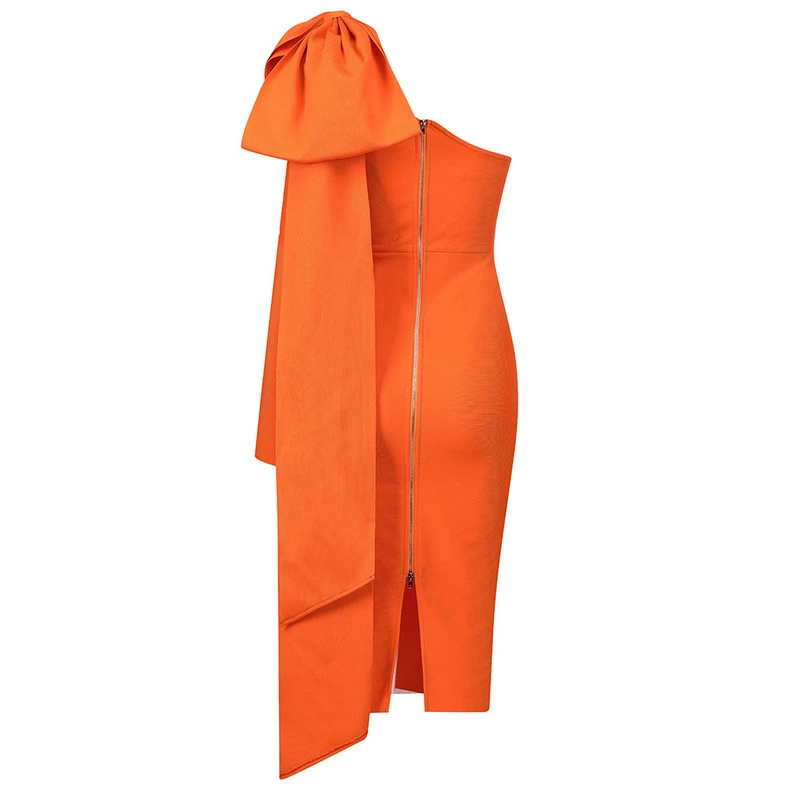 Оптовая продажа, Новое поступление 2021, оранжевые женские элегантные облегающие платья средней длины с бантом на плечах, Деловые женские платья