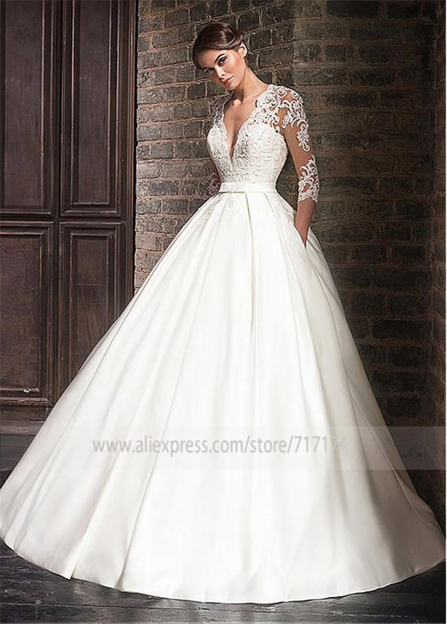 Атласные свадебные платья-трапеции с кружевом, с V-образным вырезом, 2021, свадебное платье с карманами, накладные аппликации на половину рукава