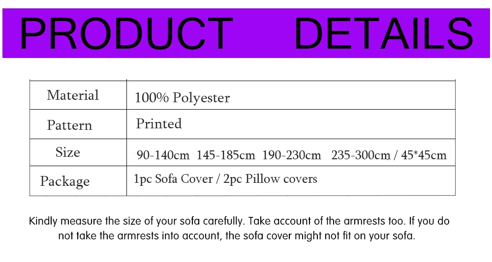 Посылка включает в себя: 1 чехол для дивана или 2 наволочки (не чехол для дивана) Примечание: В комплект входит только 1 чехол для дивана, не включая наволочку. (Цена указана только за 1 чехол для дивана, в комплект не входят наволочка или другие аксессуары, если вы хотите наволочку, вам необходимо разместить заказ отдельно.) L форма диван нужно купить 2 шт чехлы для дивана. Размер: Одноместный чехол для дивана: подходит для дивана размером 90-140 см Чехол для дивана с двойным сидением: подходит для дивана размером 145-185 см Чехол для дивана с тремя сиденьями: подходит для дивана размером 190-230 см Чехол для дивана на четыре сиденья: подходит для дивана размером 235-300 см Применимый диван: безрукий диван, подлокотник диван, l-образный диван, секционный диван Пожалуйста, измерьте свой диван с подлокотником, затем выберите размер, если вы не измерите его, крышка дивана будет меньше, чем ваш диван. Обратите внимание: 1. Этот чехол для дивана подходит для дивана, который имеет зазор, между сидением со спинкой и подлокотником. (Пожалуйста, убедитесь, что ваш диван имеет глубокий зазор, чтобы выскользнуть пенопластовые стержни перед покупкой. Наш чехол для дивана не подходит для дивана с мелким зазором.) 2. Пожалуйста, измерьте свой диван с подлокотником, затем выберите размер, если вы не измерите его, крышка дивана будет меньше, чем ваш диван. 3. Допускается погрешность в 1-3 см при ручном измерении, разные страны имеют разный размер, пожалуйста, проверьте его перед покупкой. 4. Из-за проблем с транспортировкой на большие расстояния, продукт будет немного складываться, он может быть не таким плоским, как на картинке, но доза не влияет на использование. 5. Поскольку разница между различными мониторами, изображение может не отражать фактический цвет товара. Мы гарантируем, что рисунок такой же, как показано на фотографиях.
