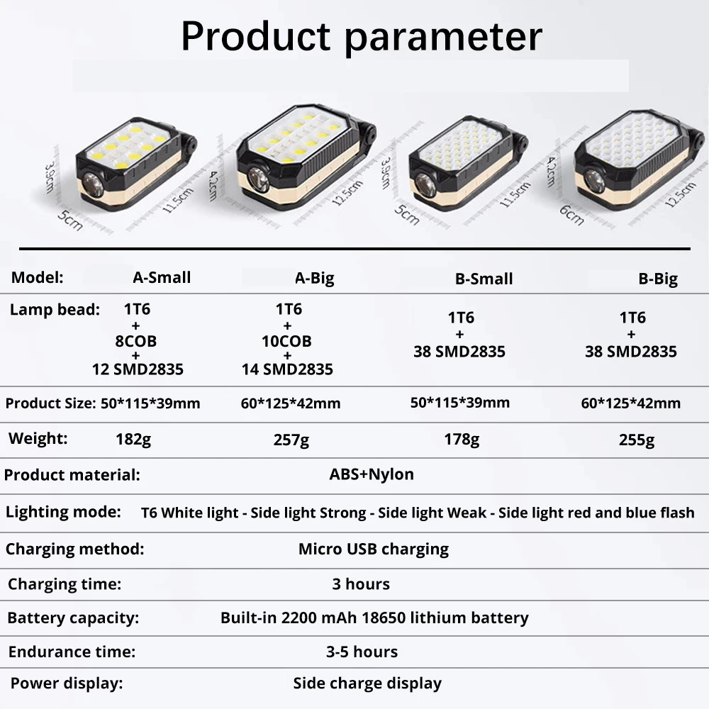 Основной параметрТип AШарик лампы: T6 + 8COB + 12SMD2835 красный и синий фитильРазмер изделия: 50*115*39 мм (маленький)/60*125*42 мм (большой)Вес: 182 г/257 гМатериал изделия: абс + нейлонСпособ зарядки: зарядка через USBВремя зарядки: 3 часаЕмкость аккумулятора: встроенный аккумулятор 18650 2200 мАчВремя выдержки: 3-5 часовДисплей питания: боковой дисплей зарядаТип BШарик лампы: T6 + 28SMD2835 + 10SMD2835 красный и синий фитильРазмер изделия: 50*115*39 мм (маленький)/60*125*42 мм (большой)Вес: 178 г/255 гМатериал изделия: абс + нейлонСпособ зарядки: зарядка через USBВремя зарядки: 3 часаЕмкость аккумулятора: встроенный аккумулятор 18650 2200 мАчВремя выдержки: 3-5 часовДисплей питания: боковой дисплей зарядаОсобенности1: продукт имеет индикатор питания, вы всегда можете узнать оставшуюся батарею.2: есть мощные магниты на дне, вы можете прилипать к любой железной поверхности.3: Нижняя рама может быть превращена в крючок и может быть подвешена во многих местах.4. Оснащен чередующимися красными и синими огнями, которые могут использоваться в качестве предупреждающих огней