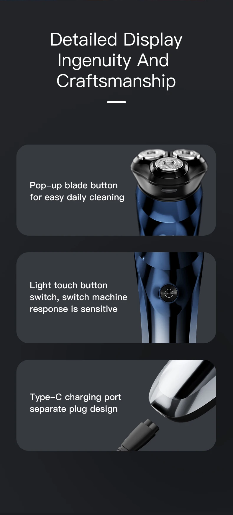 Спефикация:1. Модель: BlackStone32. Материал: АБС-пластик, нержавеющая сталь3. Лезвие: нержавеющая сталь4. Тип работы: электрический5. Особенности: 3D плавающая Три головки бритвы6. Состояние использования: сухой, влажный7. Мощность (W): 5 Вт8. Напряжение: 5 В9. Чистка: Моющаяся10. Емкость аккумулятора (мАч): 1400 мАч11. Частота (Гц): 50/60 ГцОсобенности:● Водонепроницаемый IPX7● 3d-плавающая режущая головка● Интеллектуальный дорожный замок● Выносливость в течение 3 месяцев● Интеллектуальный анти-пинч● TYPE-C зарядки● Интеллектуальная защита от блокировки● Дисплей питания● Подсказки для зарядки● Советы по стирке