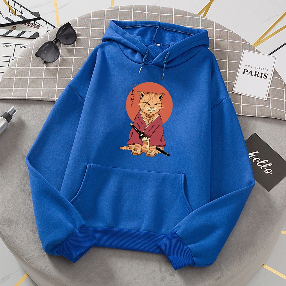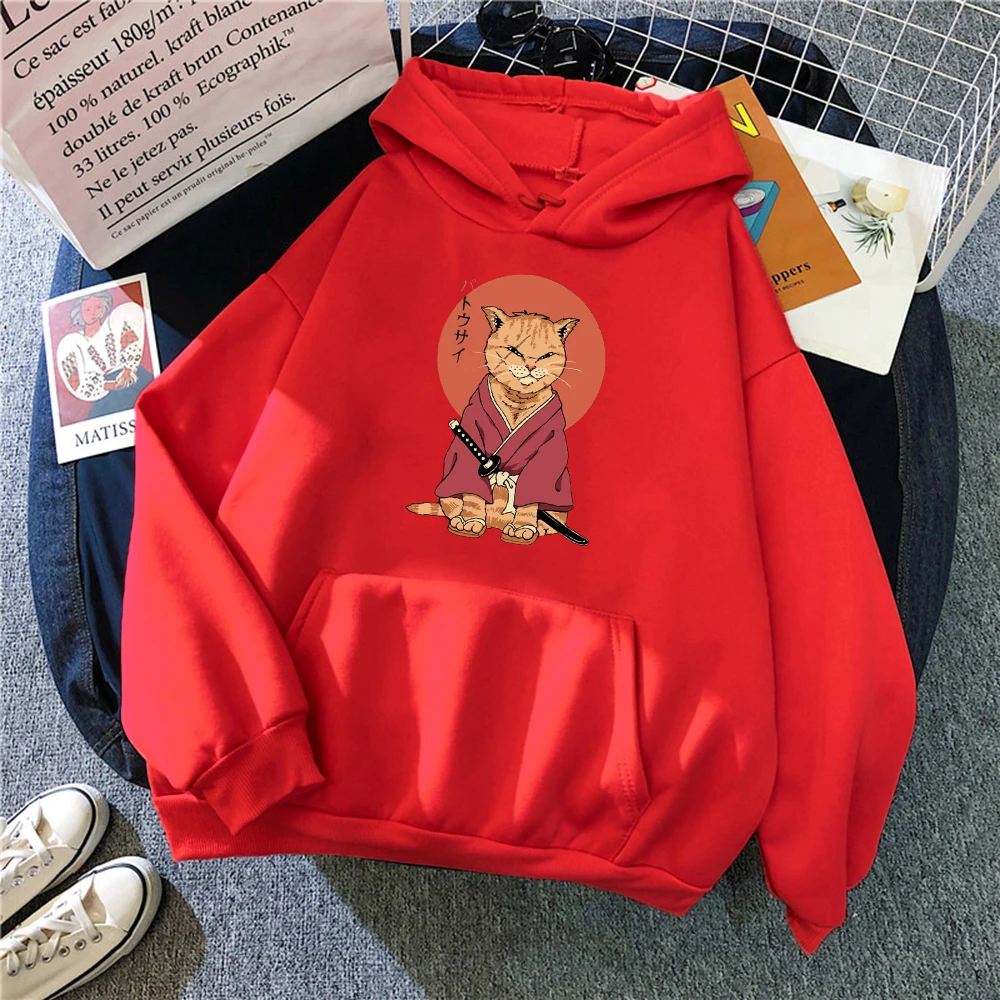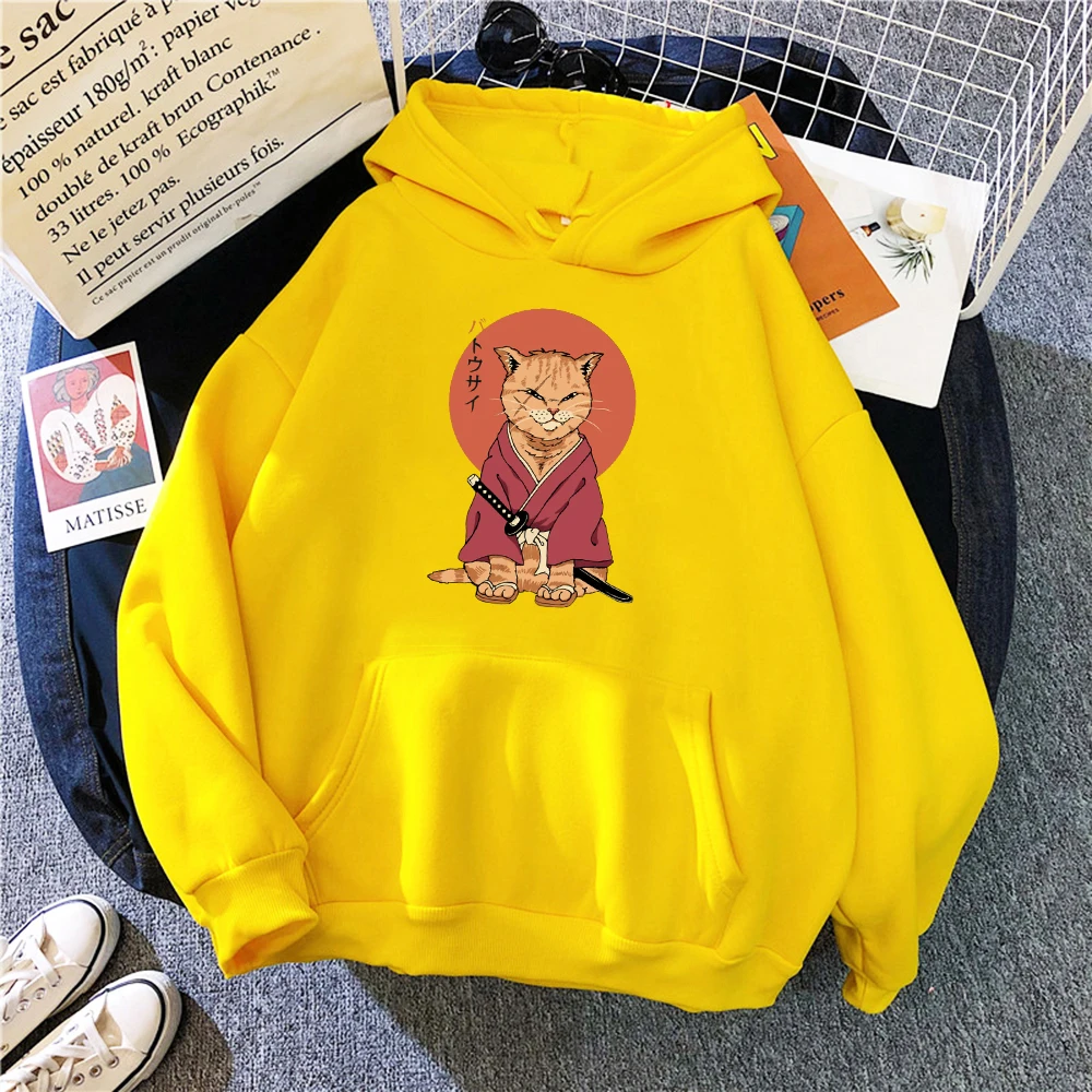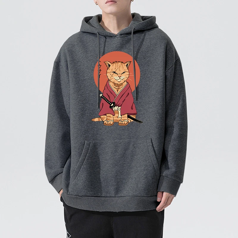 Толстовка мужская с мультяшным принтом кошки, мягкая брендовая уличная одежда в японском стиле катана, теплое винтажное худи, большие размеры