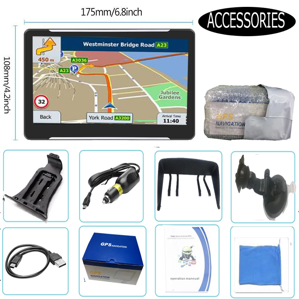 Спецификация:Цвет: черныйМатериал: АБС-пластикЧип: MTKЭкран: 7 дюймов сенсорный экран Экран, высокая яркость, ЭкранРазрешение: 800x480 пикселейRAM: SD RAM 256MBROM: 8 Гб RAMЦП: 800 МГцОперационная система: для Windows CE 6,0FM: ПоддержкаGPS: поддержкаВид сзади: не поддерживаетсяПодключение: USB 2,0Аккумулятор: встроенный литиевый аккумуляторGPS Тип: Автомобильный GPS навигация, 7-дюймовый сенсорный экранПолночастотный fm-передатчик: выход аудио от этого навигатора к вашему автомобильному стереоАудиовыход порта наушниковАудио плеер/видеоплеер/браузер изображений/калькулятор/конвертер единиц/Календарь/играПоддерживаемая Внешняя память: TF карта максимум 32 г (не входит в комплект)Входное напряжение: 5 В постоянного тока 1.5A-2A (мини USB интерфейс)Слот для карты TF: разъем для наушниковРазвлечения: игры, фильмы, музыка, фотоальбомыЯзык: английский, французский, немецкий, итальянский, португальский, русский, испанский, польский, венгерский, Римский, словенский и т. Д.Размер продукта: 190x110x17 мм/7,48x4,33x0,67 "(Д x Ш x В)Вес брутто: 522 г