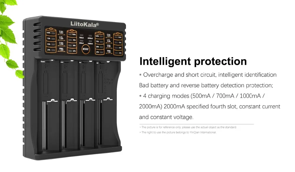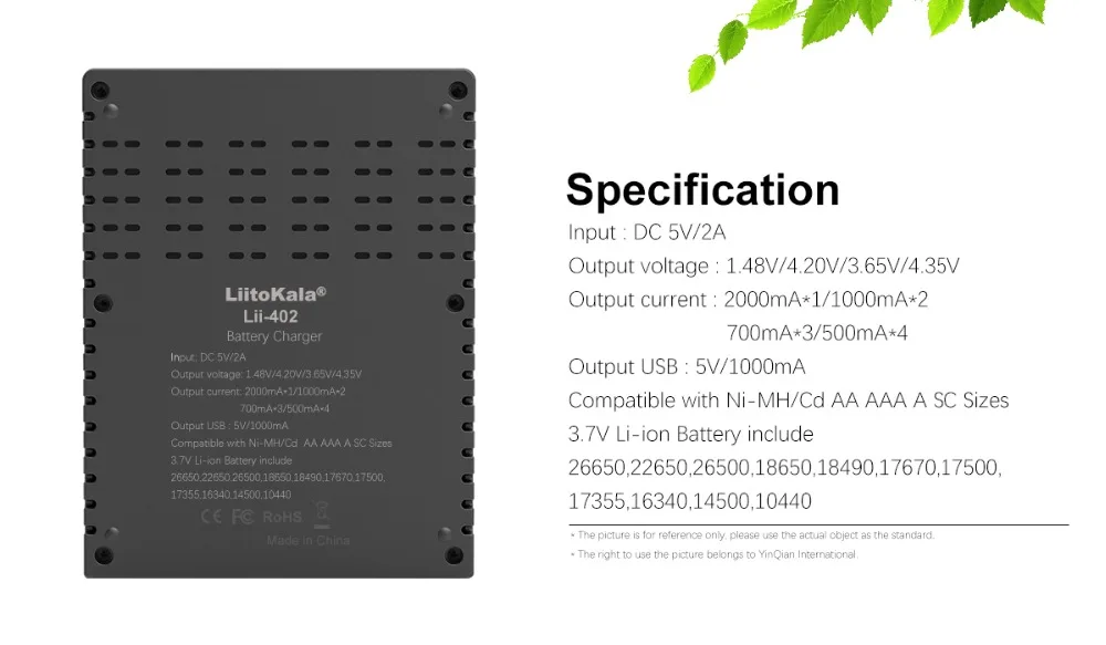 Вход: 5 В/2 а постоянного токаВыходное напряжение: 1,48 в/4,20 в/3,65 в/4,35 вВыходной ток: 2000ма * 1/1000мА * 2700ма * 3/500мА * 4Выход USB : 5 В/1000 мАСовместим с Ni-MH/Cd AA AAA A SC размерами3,7 V литий-ионный аккумулятор включает26650,22650,26500,18650,18490,17670,17500,17355,16340,14500,10440Особенности-Вход Micro USB DC 5V;-4 варианта зарядки (500мА/700мА/1000мА/2000ма)2000 мА обозначенный 4-й слот;-Светодиодный индикатор заряда составляет 25%, 50%, 75%, 100%; Перезарядка,Защита от короткого замыкания;-Автоматическая идентификация типа батареи (литий-ионный аккумулятор,Никель-металлогидридный аккумулятор);