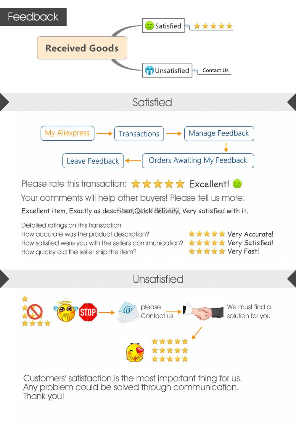 1. Мы дорожим каждой сделкой, даже если только небольшой заказ, вы всегда будете нашим клиентом.2. Если на этой странице вы не найдете то, что вам нужно, пожалуйста, посетите наш магазин.3. Мы обещаем, что продукт высокого качества и идеален.4. Вы всегда можете связаться со мной, независимо от того, есть ли у вас какие-либо вопросы. Мы ответим в течение 24 часов.5. Если вы недовольны качеством товара или временем транспортировки. Надеюсь, что вы не открываете спор сразу, пожалуйста, свяжитесь с нами, чтобы решить эти проблемы, и мы постараемся сделать все возможное, чтобы дать вам лучший опыт.