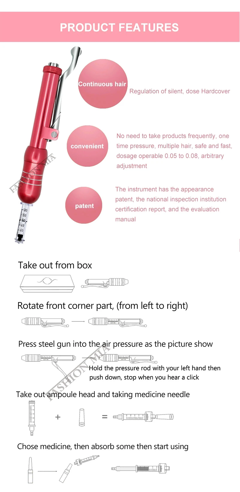 -Помогает уменьшить пятна, морщины и следы. Функция подтягивания и наполнения-Увеличение уровня коллагена для создания новой и молодой кожи, что обеспечивает омоложение кожи.-Улучшает кожу, восстанавливает эластичность кожи, улучшает старение.-Может сделать Антивозрастные продукты попадают в глубину кожи, не повреждая кожу, без побочного эффекта, безопасно для использования.-Глубокое Пополнение и богатое питание, укрепляет кожу, чтобы впитать продукт красоты.-Он используется для более чем 10000 инъекций, и Он управляется самоприводной пружиной.-Быстрая инъекция менее 1/3 секунды, микро отверстие и автоматическое пружинное давление делают инъекции безопасными и безболезненными-Удалите меланин в теле, улучшите темную и желтую кожу, сделайте кожу яркой и белой.