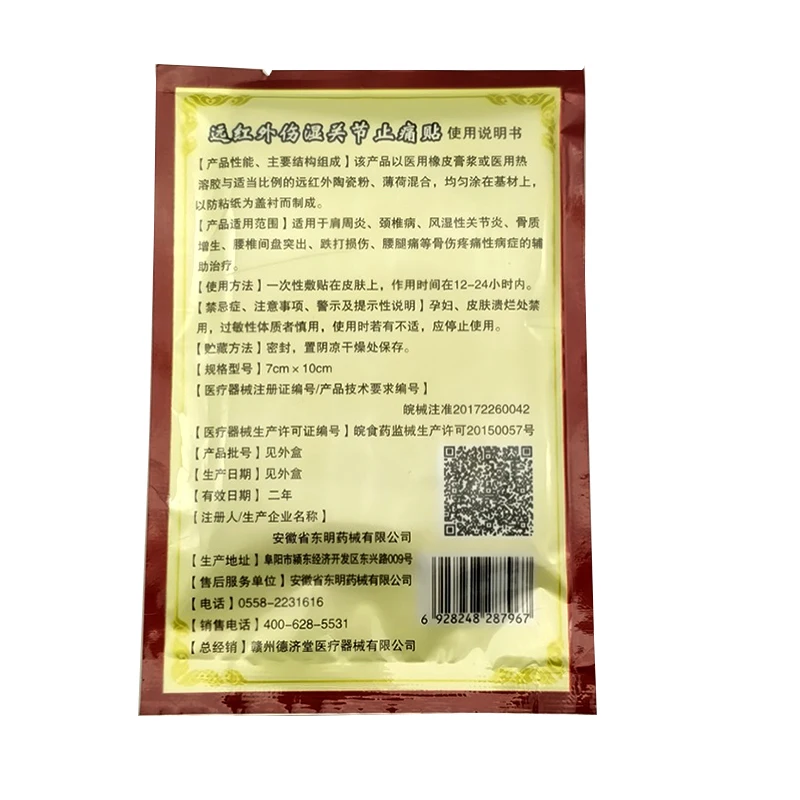 La longitud de onda de emisión de IR lejano es de 8um-15um. Alcance adecuado: ayudar al tratamiento de la colomna vertebral, la periartritis del hombro, la tensión muscular lumbal, el dolor de las articulaciones de la rodilla. Таманьо: 7 см * 10 см Особенности: 8 Uds./1 bolsa Инструкции: 1. Adultos y niños mayores de 12 años: se aplican a la zona conformdiente segun sea necesario, no mаs de 3 veces al Dia durante 7 datias. 2. Ниньос менорес де 12 аньос: consulte con un médico. 3. Limpiar y secar el Area efectuada. 4. В отставку de la película de respaldo y aplíquela, списать de la piel después de una приложение de más de 8 horas. Deje de usar y pregente a un médico si: 1. Se производит извержение, dolor o irritación excesiva de la piel. 2. Las condiciones cambian. 3. Los sintomas persiana durante mаs de 7 déas o aclaran y acceed de nuevo dentro de unos déas. Cómo usar: 1. Lavese las manos antes de aplicar el parche. 2. Limpia y seca la zona afectada. 3. Dobla el parche y retira la Pelicula para exponer el lado adhesivo. 4. Aplica el lado adhesivo directamente sobre la piel en la zona afectada. 5. Solo использует un parche en el Area afectada, el parche puede durar hasta 8-12 horas. 7. Lavese las manos después de quitar el parche. 8. Si el dolor es consistente 8-12 horas después del primer parche y se puede aplicar el segundo parche. 9. Retira el primer parche antes de aplicar uno nuevo. 10. 8-12 horas por cada vez, 4-5 veces por semana.