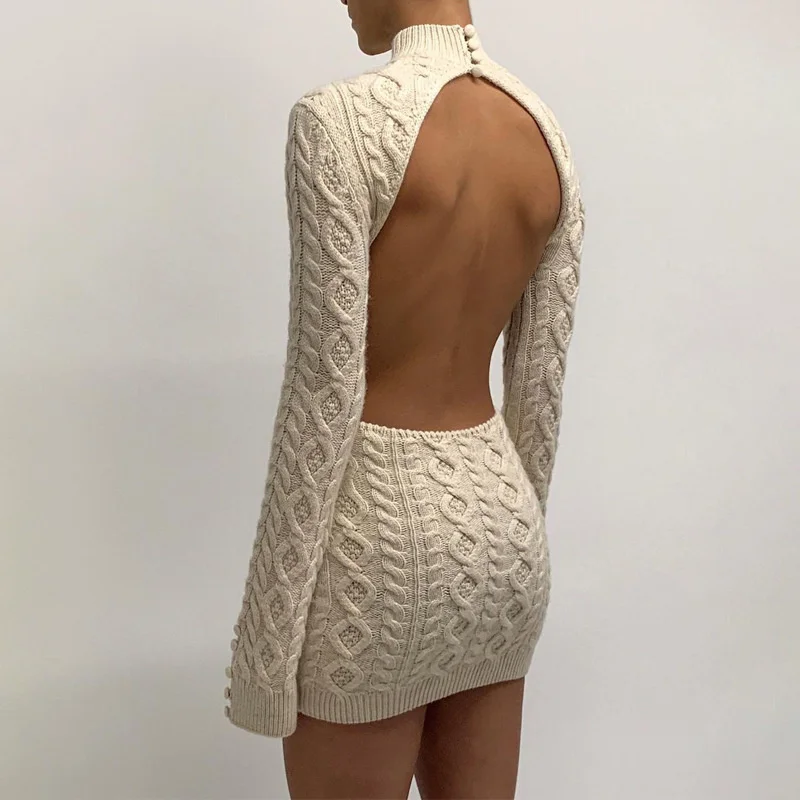 Вязаное мини-платье с открытой спиной, сексуальное модное облегающее платье с длинным рукавом, зима 2021, открытые вечерние платья с высоким воротом для женщин