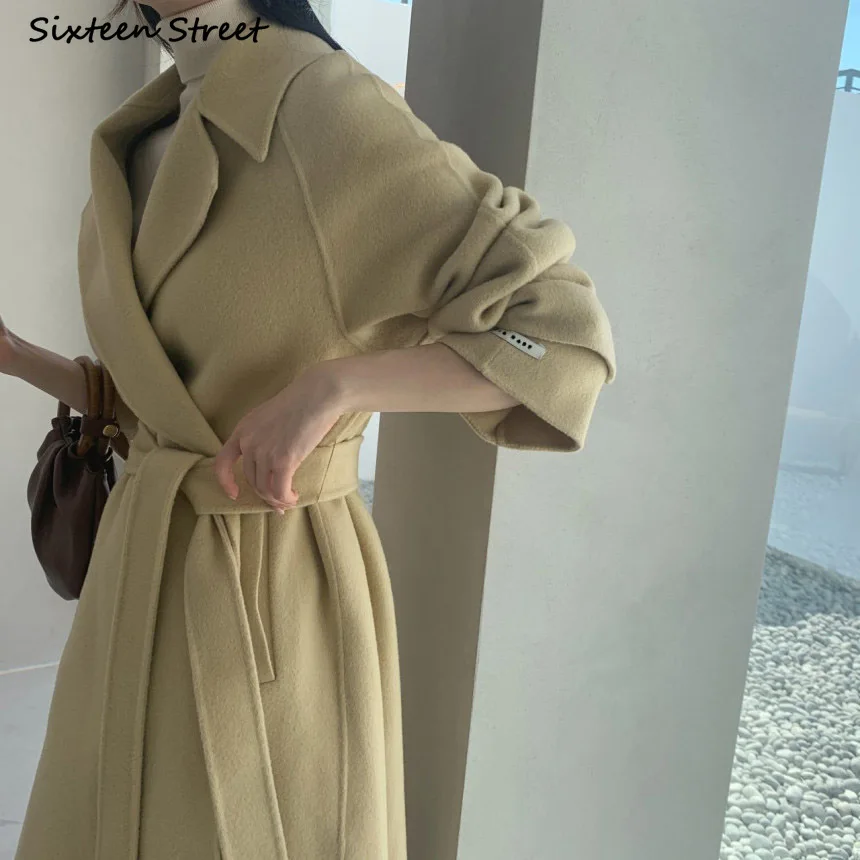 Женское шерстяное пальто со шнуровкой, длинное плотное пальто цвета...
