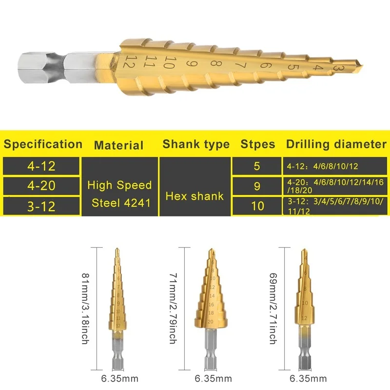 31/4" Step Cone Taper Drill Bit Set Metric Metal Hex Drill Bits