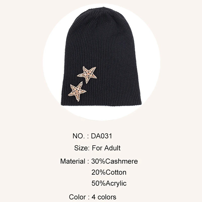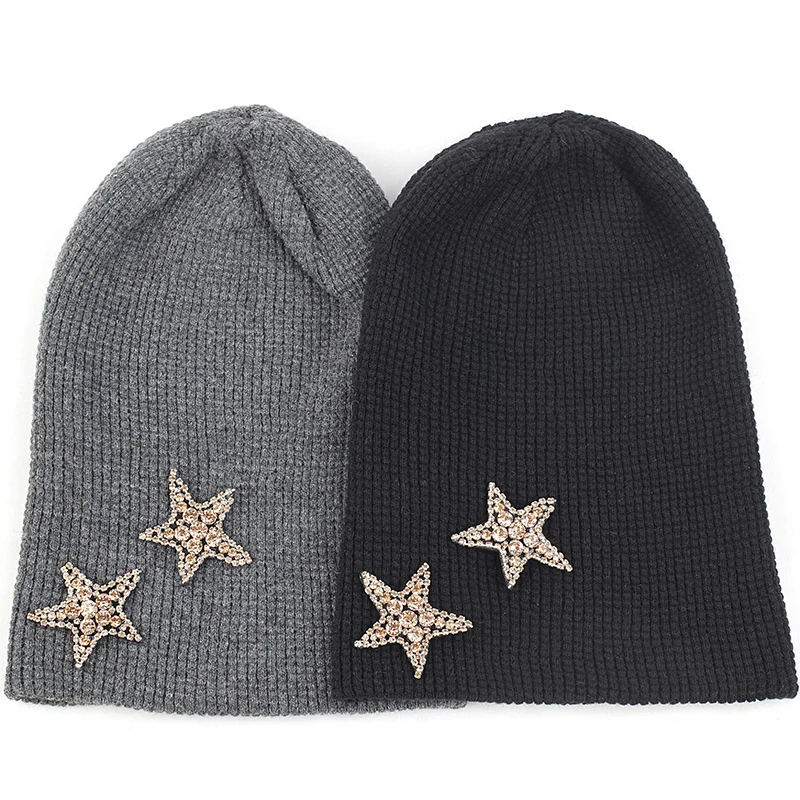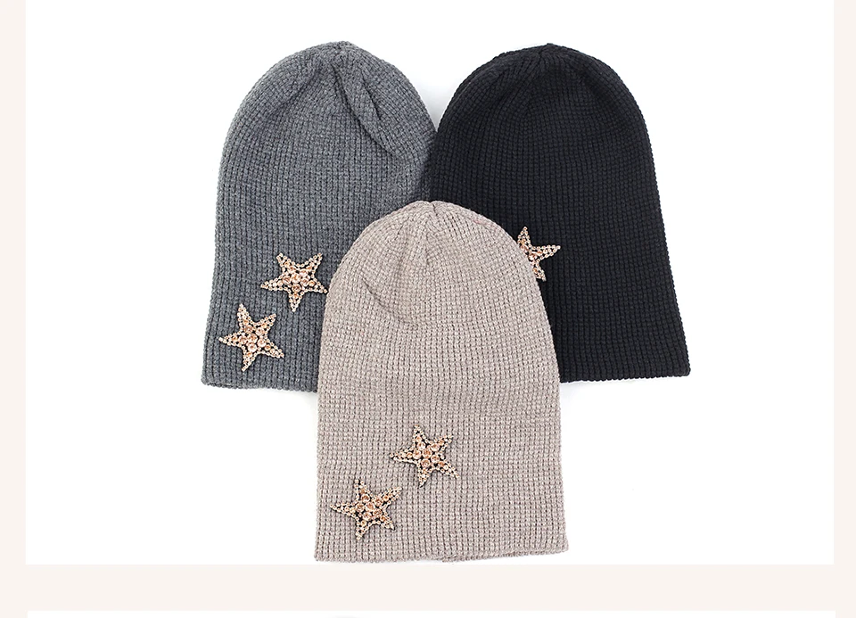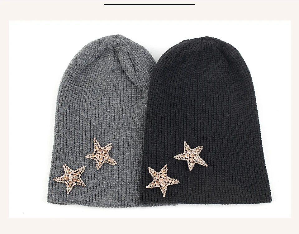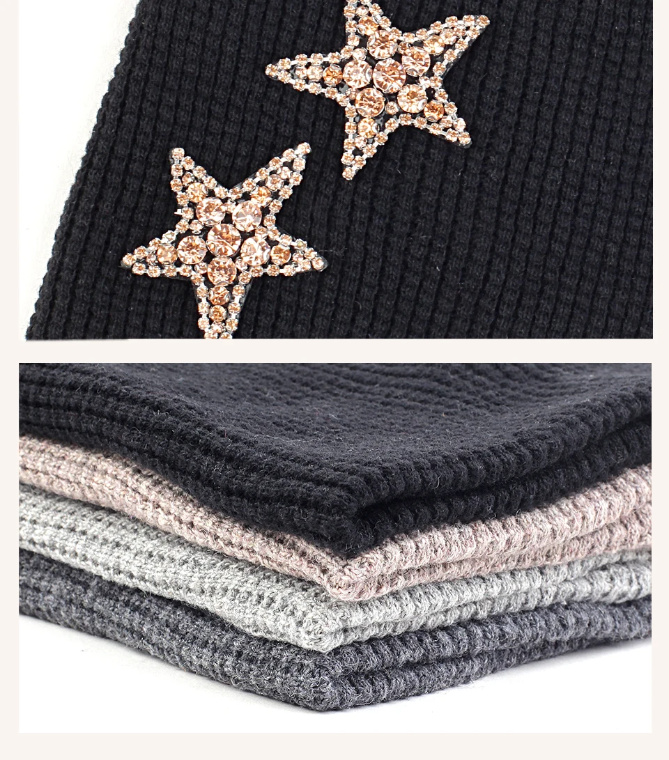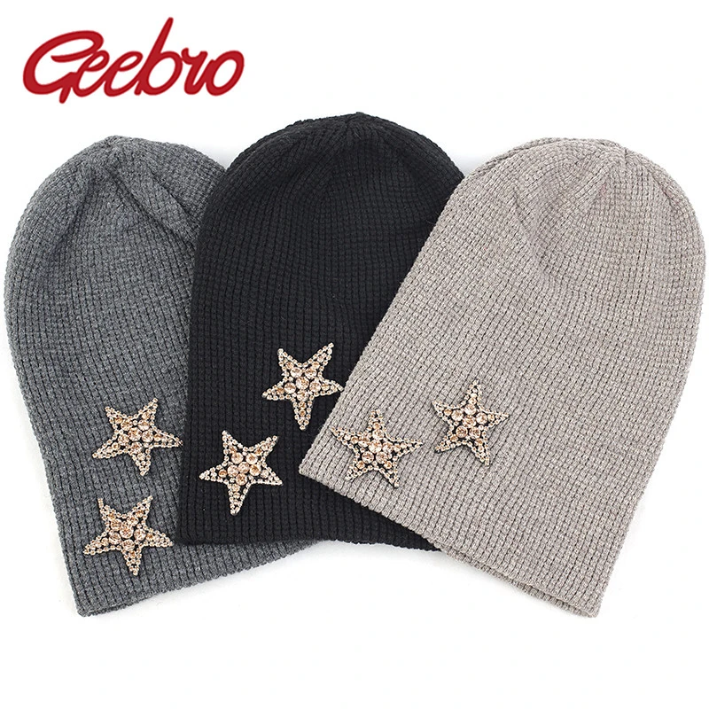 Geebro Женская кашемировая шапка 2 бриллианта звезды стразы аксессуары шляпа мягкая теплая шапка Череп дамские шапочки пуловер шляпы