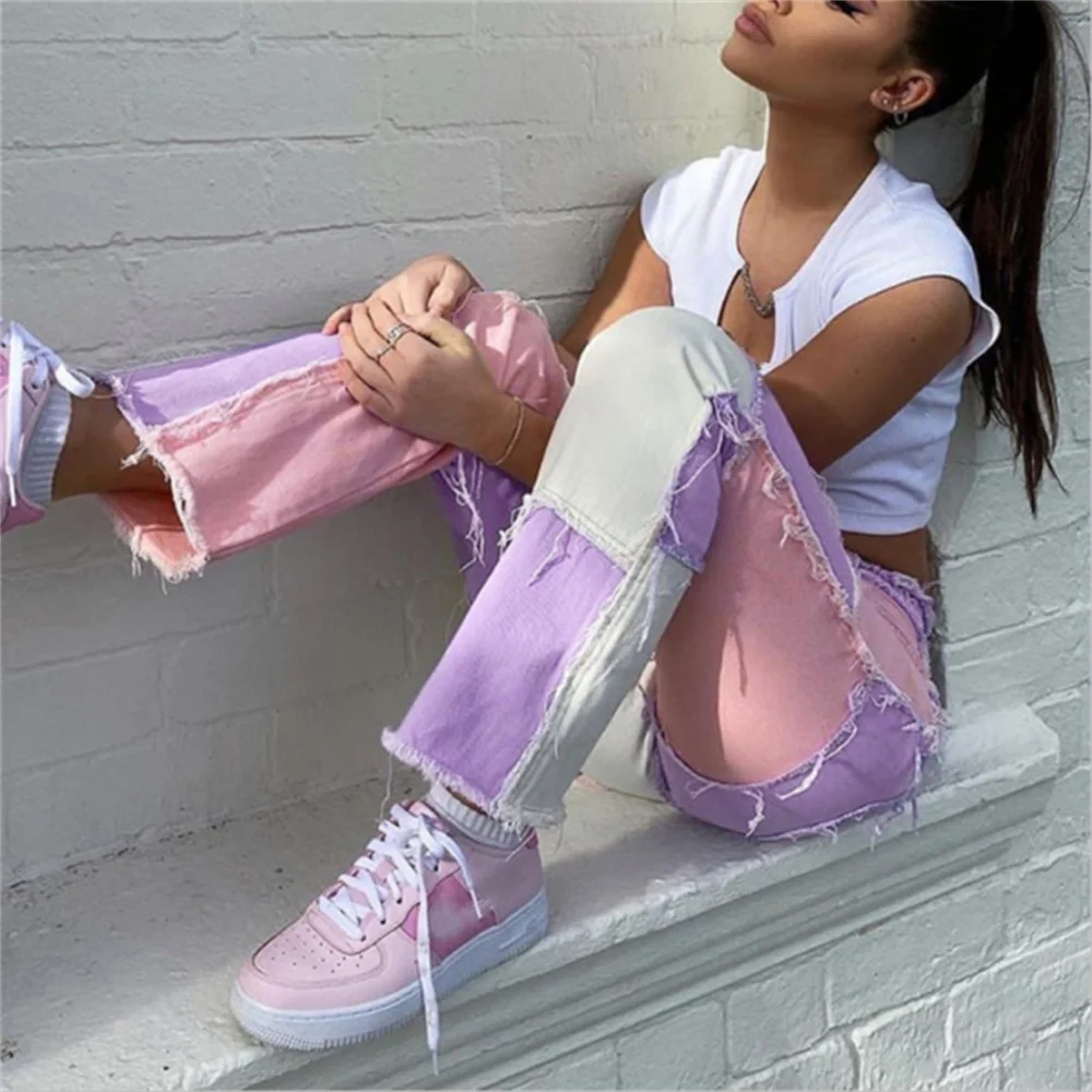 Женские джинсы с высокой талией, прямые брюки в стиле хип-хоп с контрастной панелью, 2021