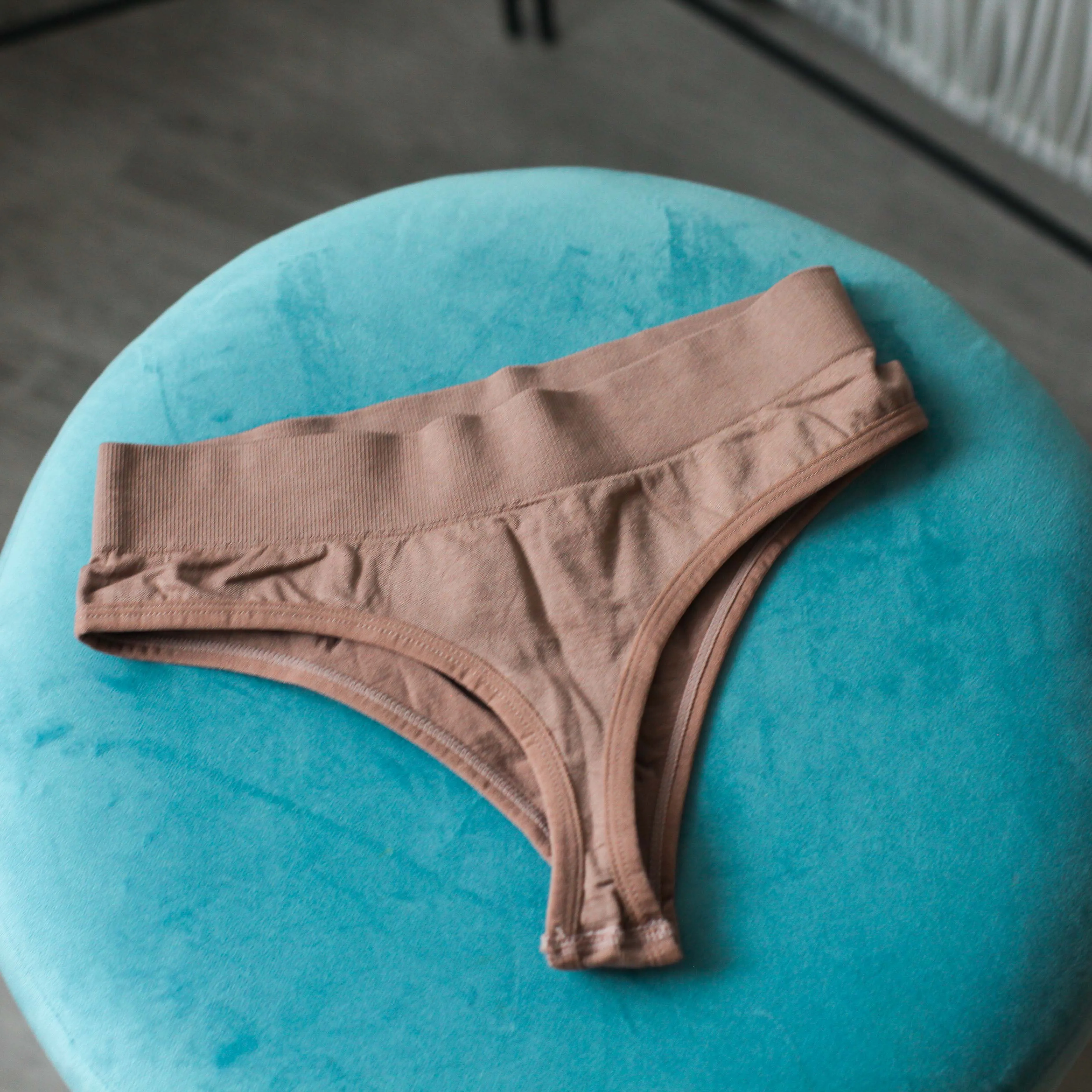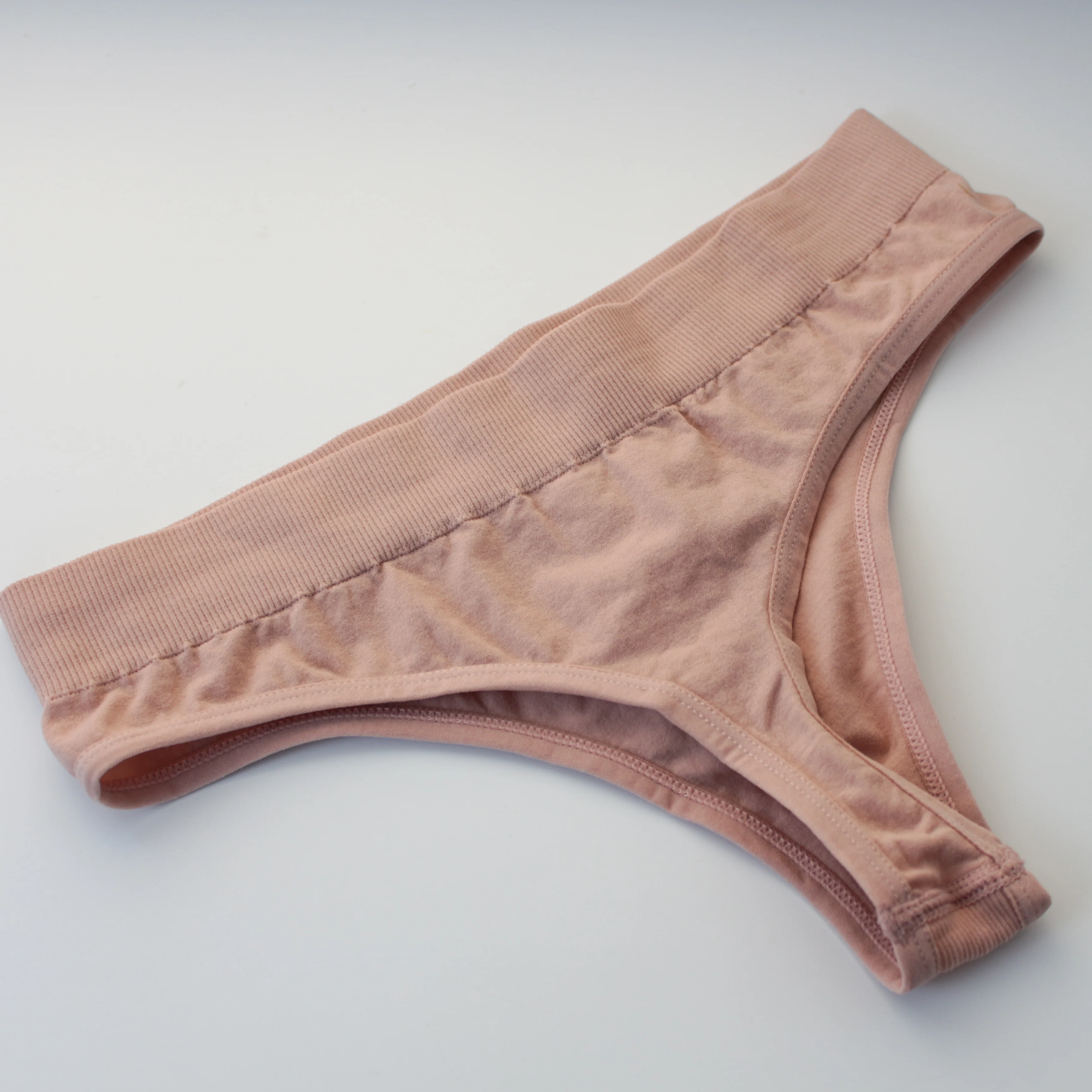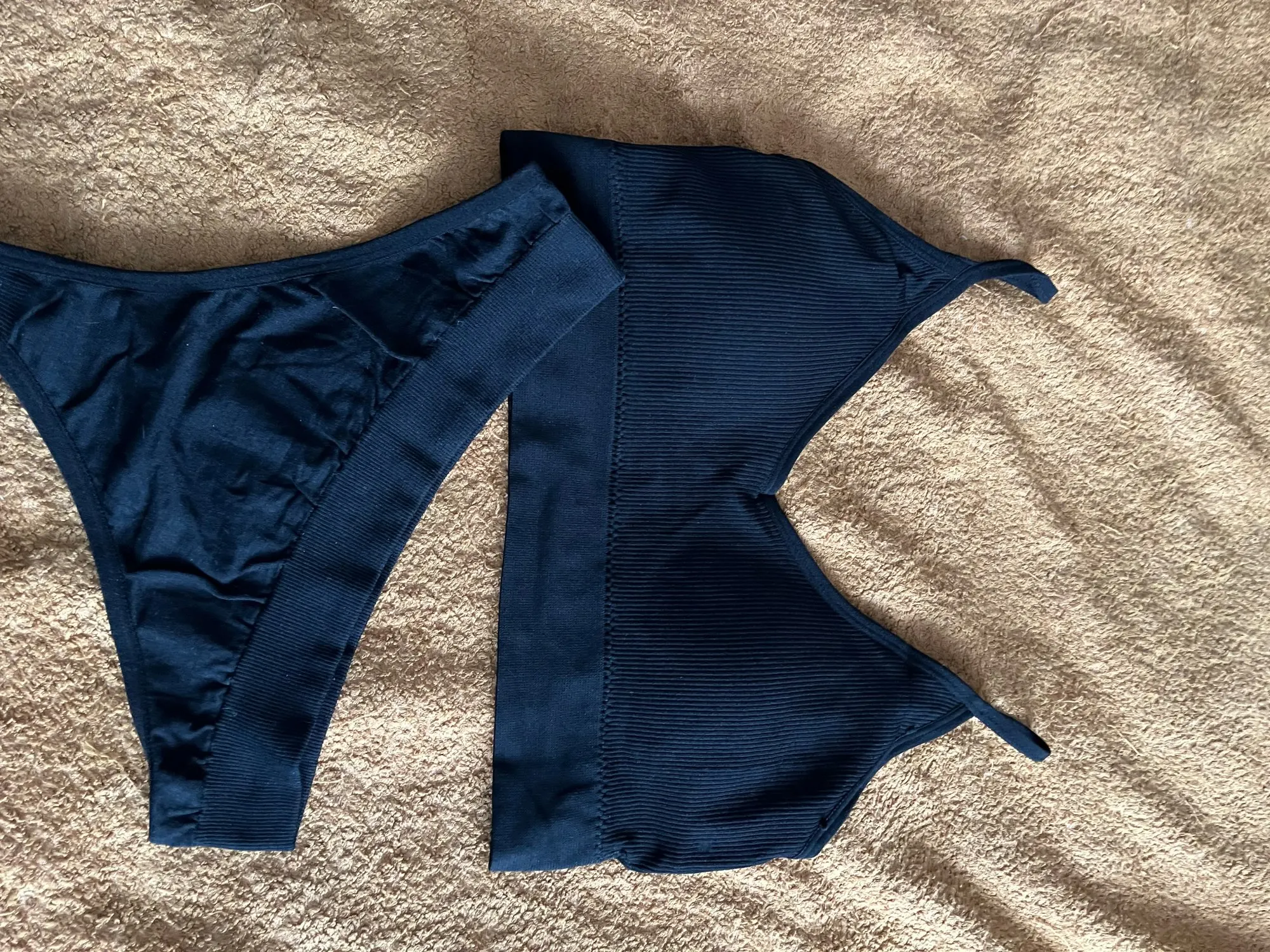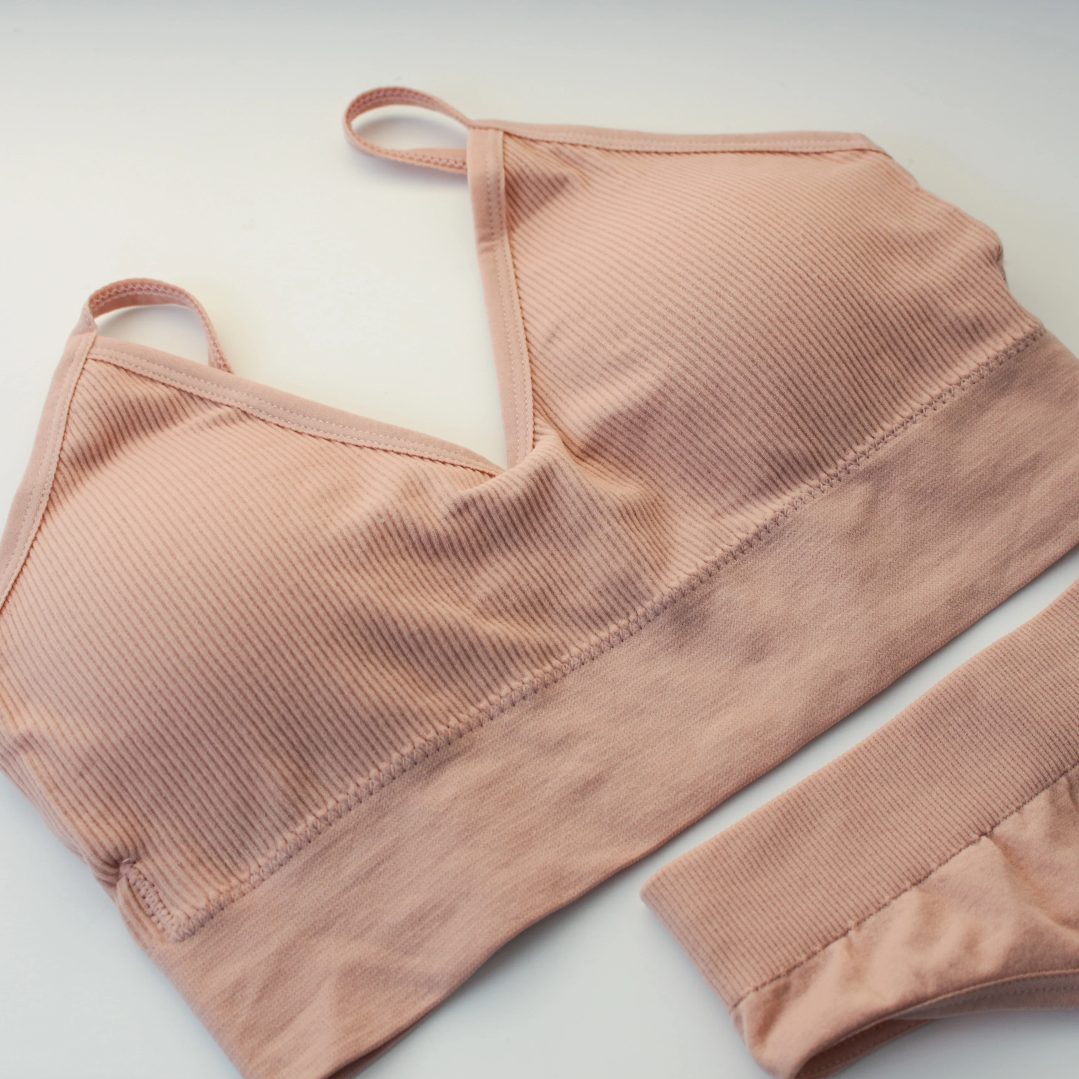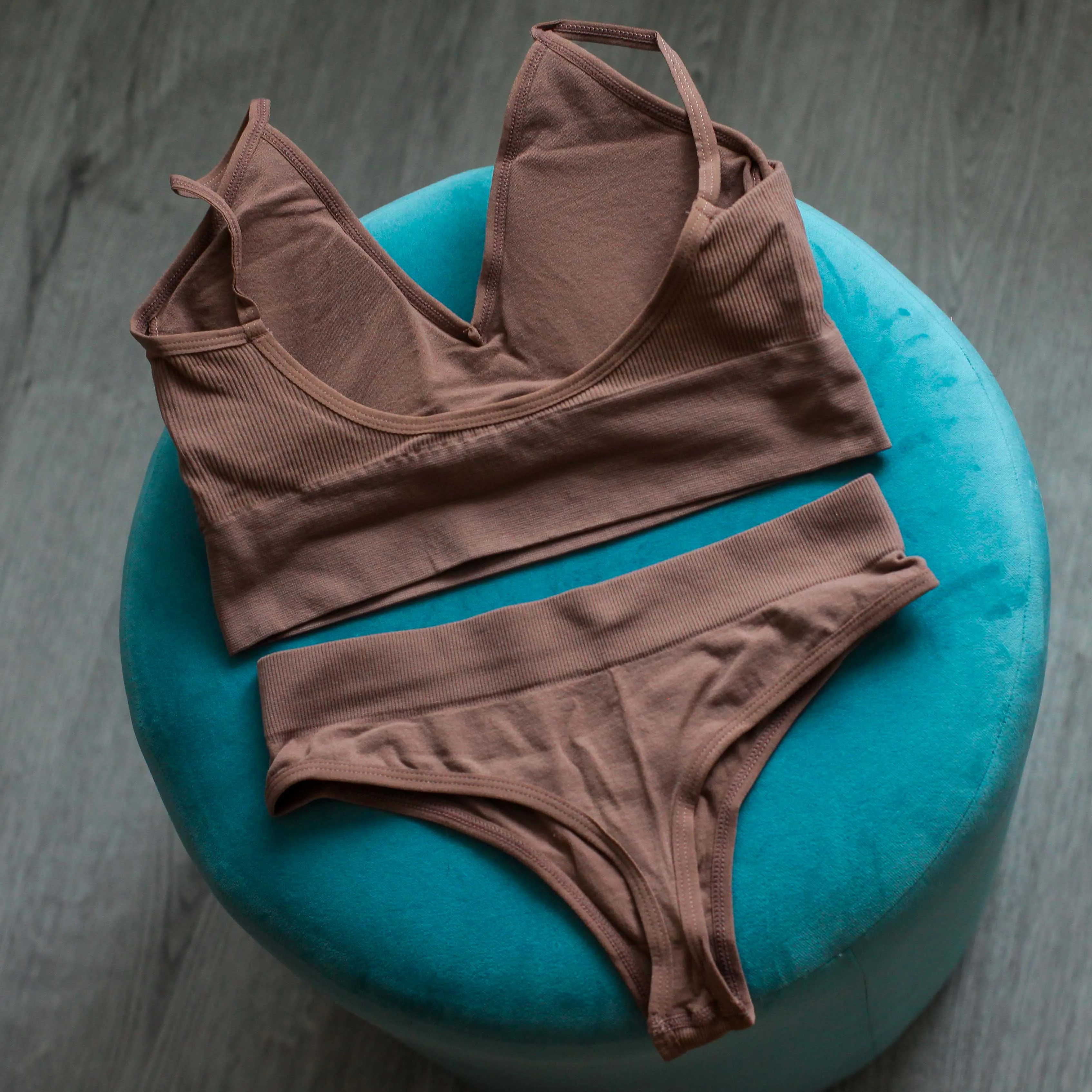 Состоит комплект из топа и трусиков. Изготовлены из одинаковой по составу ткани, с элементами в рубчик, но вот на топе полосы шире, чем на трусиках. Продавец заявляет, что это нейлон и лайкра. Синтетика, приятная, эластичная и хорошо тянется Я взяла в цвете какао или кофе с молоком. Очень красивый, приятный, не яркий сет. Топ комфортный. Спереди на груди треугольники и максимально открытая спинка. Чашки из тонкого поролона. Сбоку есть отверстие и можно снять. Бретели тонкие, не регулируются. Топ практически бесшовный. По бокам швов нет, только лямки пришиты и по низу полоса. С обратной стороны все аккуратно. Трусики стринги. Они тоже бесшовные. Края обшиты тонкой резиночкой. Швы аккуратные. Без торчащих ниток и других косяков. Ластовицы как таковой нет. Просто уплотнена ткань. Взяла в размере L на мои параметры ОГ - 85, ОПГ - 73, ОТ - 66 и ОБ - 90 сел комплект просто идеально. Можно и немного на большие параметры взять. Ткань отлично тянется