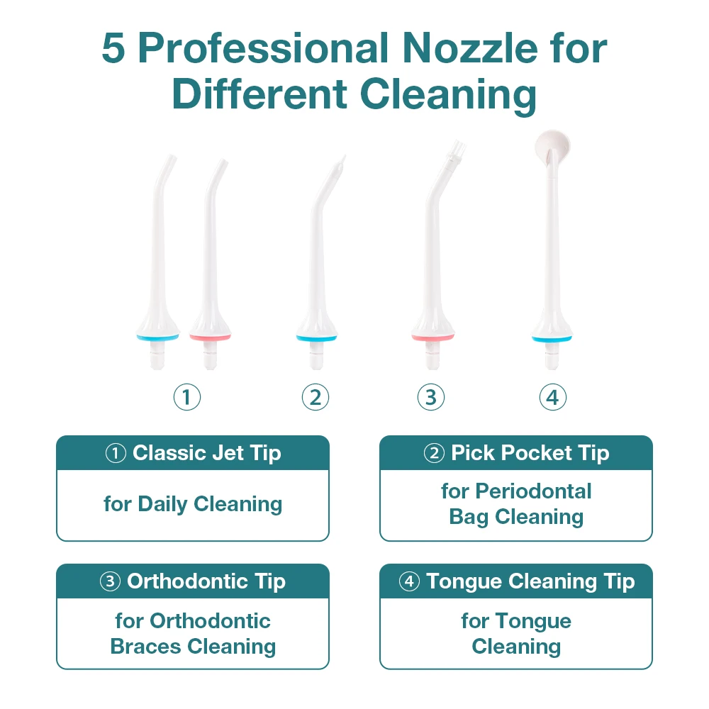 Вода flosser отбеливать любой угол полости рта: зазоры, внутренние зубы, жевательные канавки, язык или подтяжки очистки; Насадки могут быть бесплатно заменены или использовать с семьей