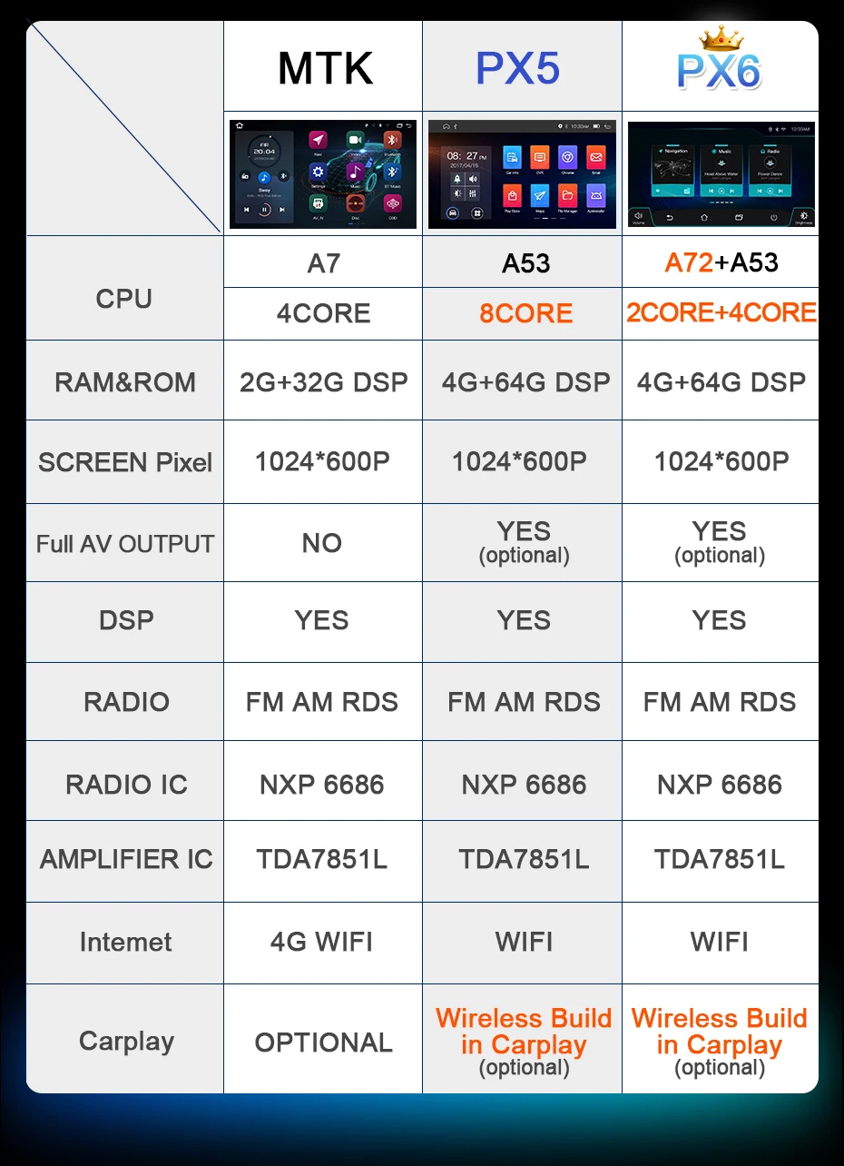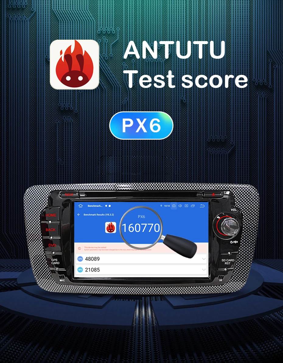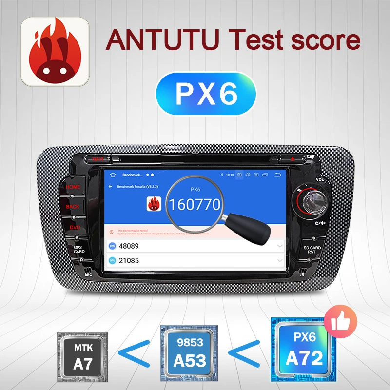 PX6PX6 является лучшим чипом на рынке в настоящее время, он работает быстрее, чем все другие типы. Балл ANTUTU составляет 160770, что лучше 9853 4G + 64G, PX5 и всех других типов 4 + 64G на рынке. По сравнению с другими радио типа fo, PX6 radio может загружать больше видов приложений android с android market, и приложение может работать лучше.