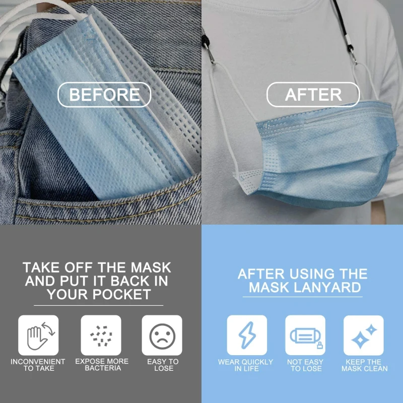 -Эти цепочки для масок не теряют вашу маску. С цепочками вы можете носить маску на шее или через плечо.