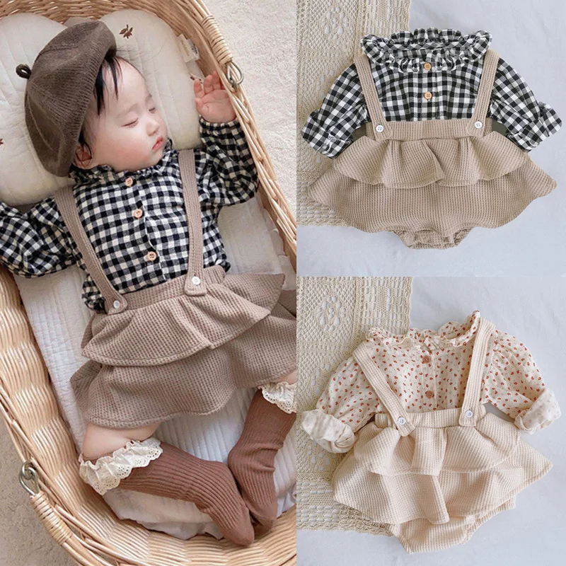 Комплект одежды для маленьких девочек 3, 6, 9, 12, 24 месяцев, зимний клетчатый Топ с длинным рукавом + комбинезон на бретелях, зимний комбинезон с цветочным принтом для новорожденных, наряды