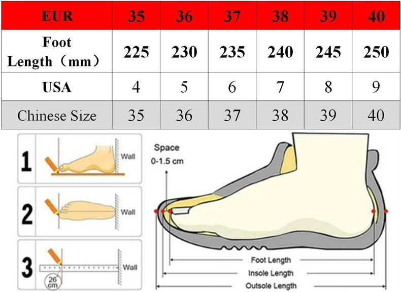 Примечание:Пожалуйста,Выберите размер в соответствии с длиной Вашей стопы, а не длиной обуви или длиной стельки, Таблица Размеров поможет вам решить проблему 90% размера.Если ваша стопа толстая и широкая, вы можете выбрать обувь на один размер больше;Если ваша стопа узкая и тонкая, вы можете выбрать один размер меньше.Если вы не знаете, как выбрать, пожалуйста, свяжитесь с нами.Было бы лучше, если бы вы указали длину стопы в заказе.Обувь, которую мы отправляемКитайский Размер s, размер обуви указан в китайском размере, а не в евро или США.Описание товара: