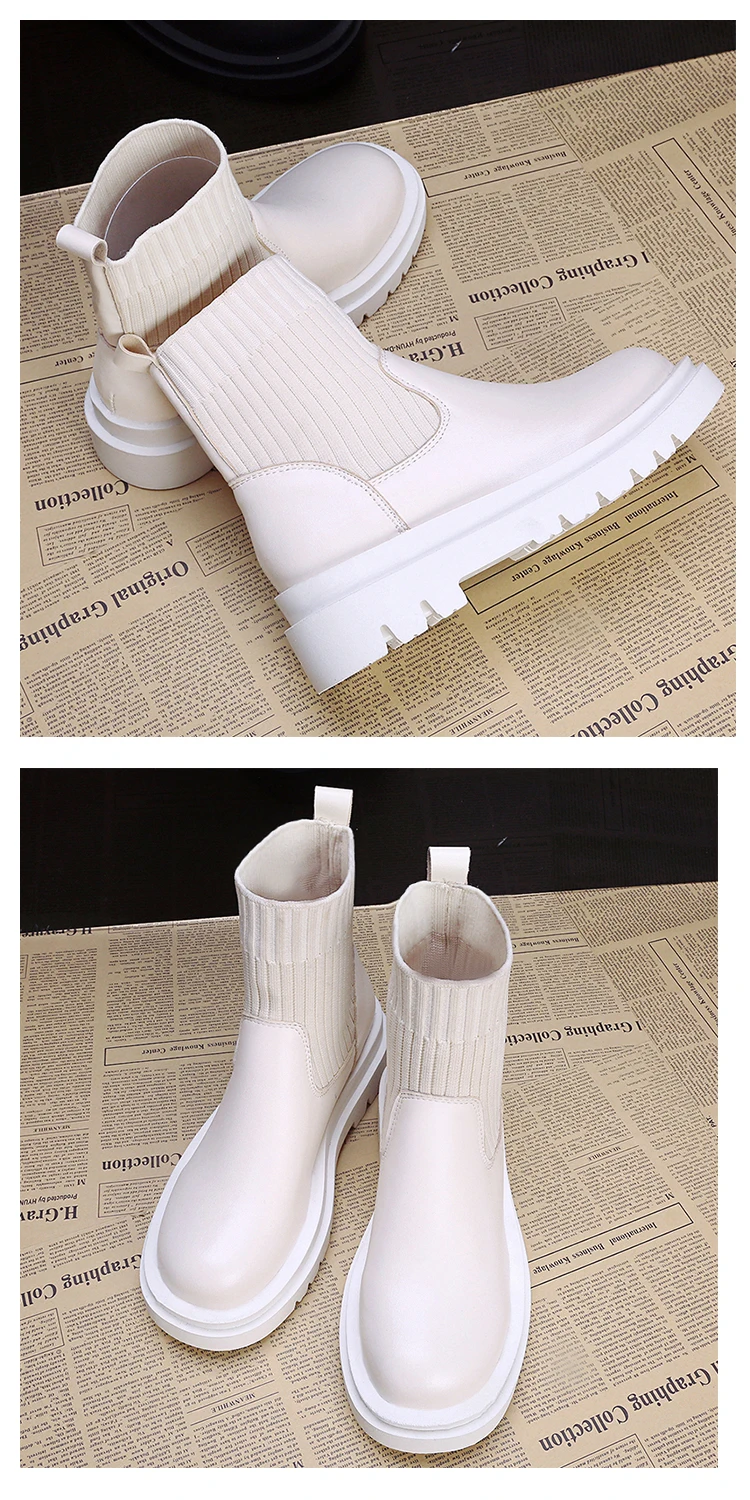 Ботильоны женские, обувь без застежки, модные вязаные эластичные женские короткие ботинки с круглым носком, кожаные ботинки на платформе и квадратном каблуке для женщин
