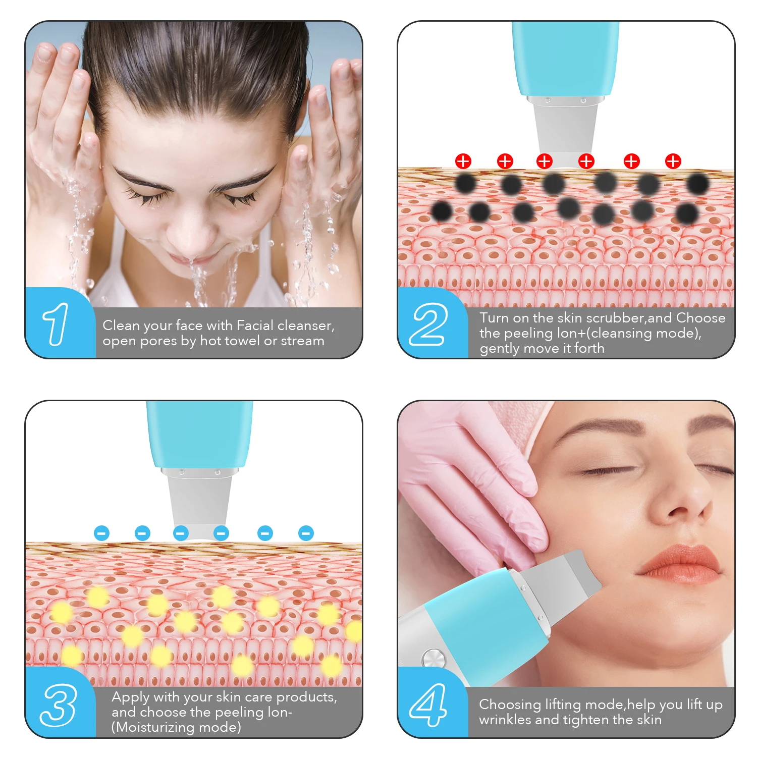 Доступны четыре различных режима работы: очистка UT, EMS уход, экспорт ионов, импорт ионов, полностью отвечает вашим многоцелевым ежедневным требованиям по уходу за кожей, практичен для решения проблем на лице ems, таких как удаление акне, борьба с черными точками, сужение пор, уменьшение морщин и подтяжка кожи.