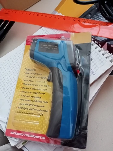 Пирометр соответствует цене. Пришел завернут в обычный пакет с пузырьками, вложена инструкция (разорвана). Внутри прибора что-то торохтит, накладка на экран была снята, лежала в пакете, на свое место встала нормально. Батареек в комплекте нет. При проверке - работает, насколько точно пока сказать не могу.