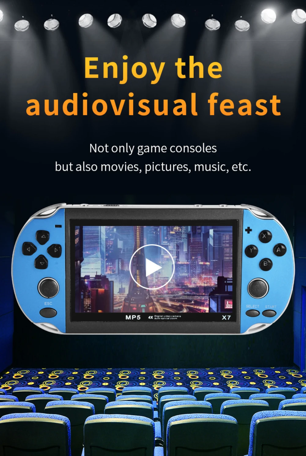 В X7 Ручной игровой консоли имеет 4,3 дюймовый экран высокой четкости, поддерживает 8/16/32/64/128-bit игры, и более чем 10000 игр.