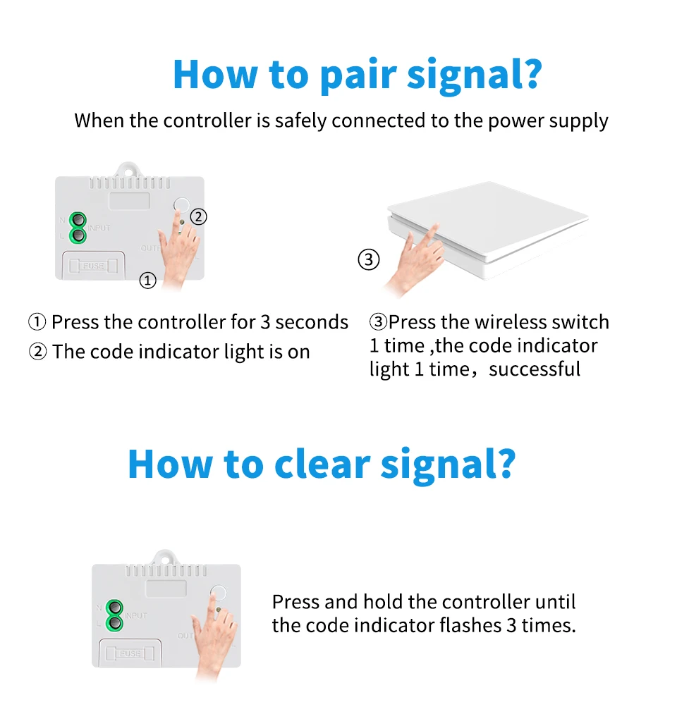 На самом деле, когда мы проводим тестирование продукта для вас, сопряжение уже сделано. Вам не нужно парить его самостоятельно. Если вам нужно выполнить сопряжение кода самостоятельно, сначала очистите код, а затем сопряните его.❤❤❤Парный сигнал1. Нажмите на контроллер в течение 3 секунд2. Светодиодный светильник3. Нажмите на беспроводной выключатель 1 раз, индикатор кода светильник 1 раз, успешно❤❤❤Чистый сигналНажмите и удерживайте контроллер, пока индикатор кода не начнет мигать 3 раза