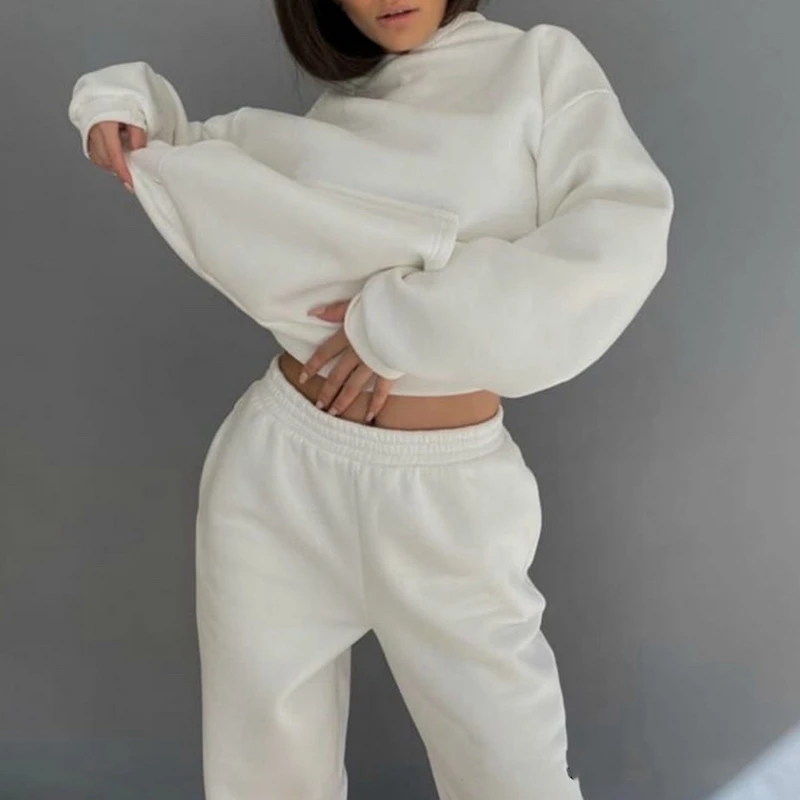 Женские однотонные комплекты, элегантные теплые толстовки с капюшоном и длинные штаны, спортивный костюм для женщин, осень 2021