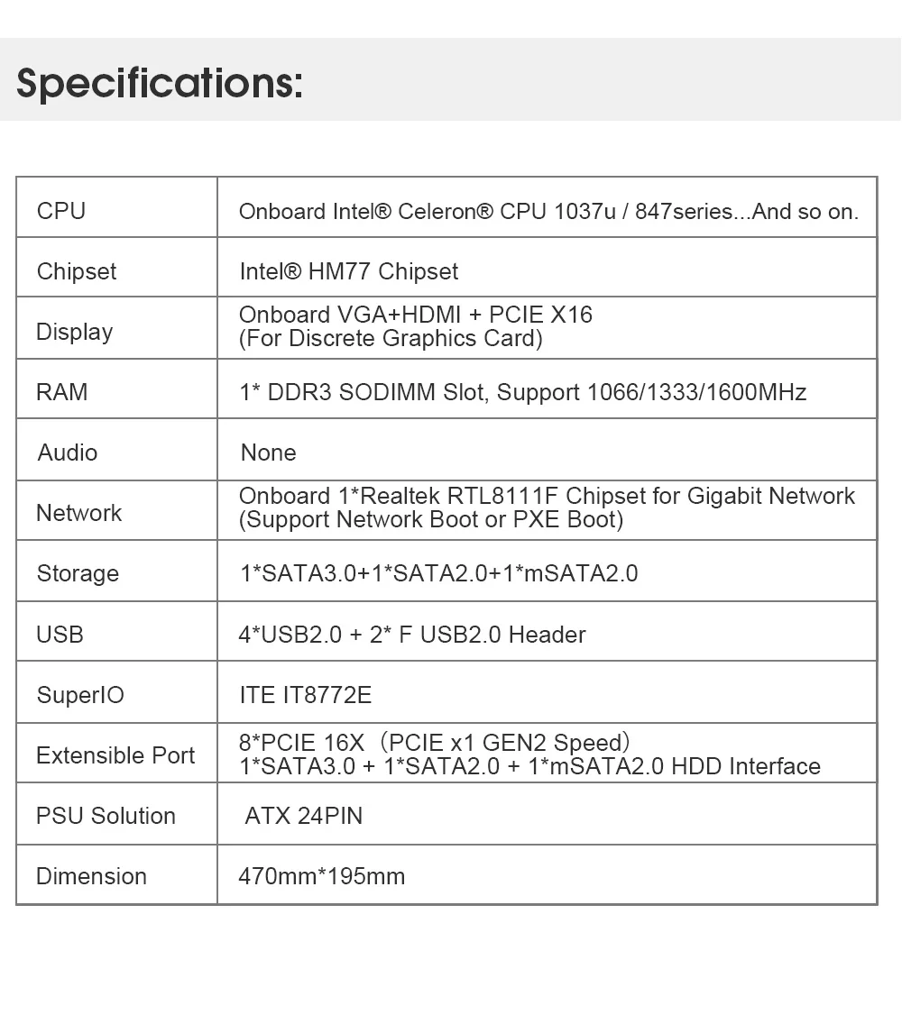 Процессор: встроенная Intel®Celeron®CPU 1037U/847 серии... и так далееНабор микросхем: Intel®Набор микросхем HM77Интерфейс GPU: 8 * PCIE 16X (скорость PCIE x1 GEN2)Память: 1 * DDR3 SODIMM слот, поддержка 1066/1333/1600 МГцСеть: Встроенный 1 * Realtek RTL8111F чипсет для гигабитной сети (Поддержка сетевой загрузки или PXE загрузки)Хранение: 1 * SATA3.0 + 1 * SATA2.0 + 1 * Интерфейс mSATA2.0 HDDUSB:4 * USB2.0 + 2 * F USB2.0 коннекторSuperIO:ITE IT8772EРасширение: 1 * com-заголовок, 1 * PS/2 заголовок, 1 * Шасси вентилятораРешение блока питания: 1*24 Pin ATX источник питанияФорм-фактор: 470 мм * 195 мм