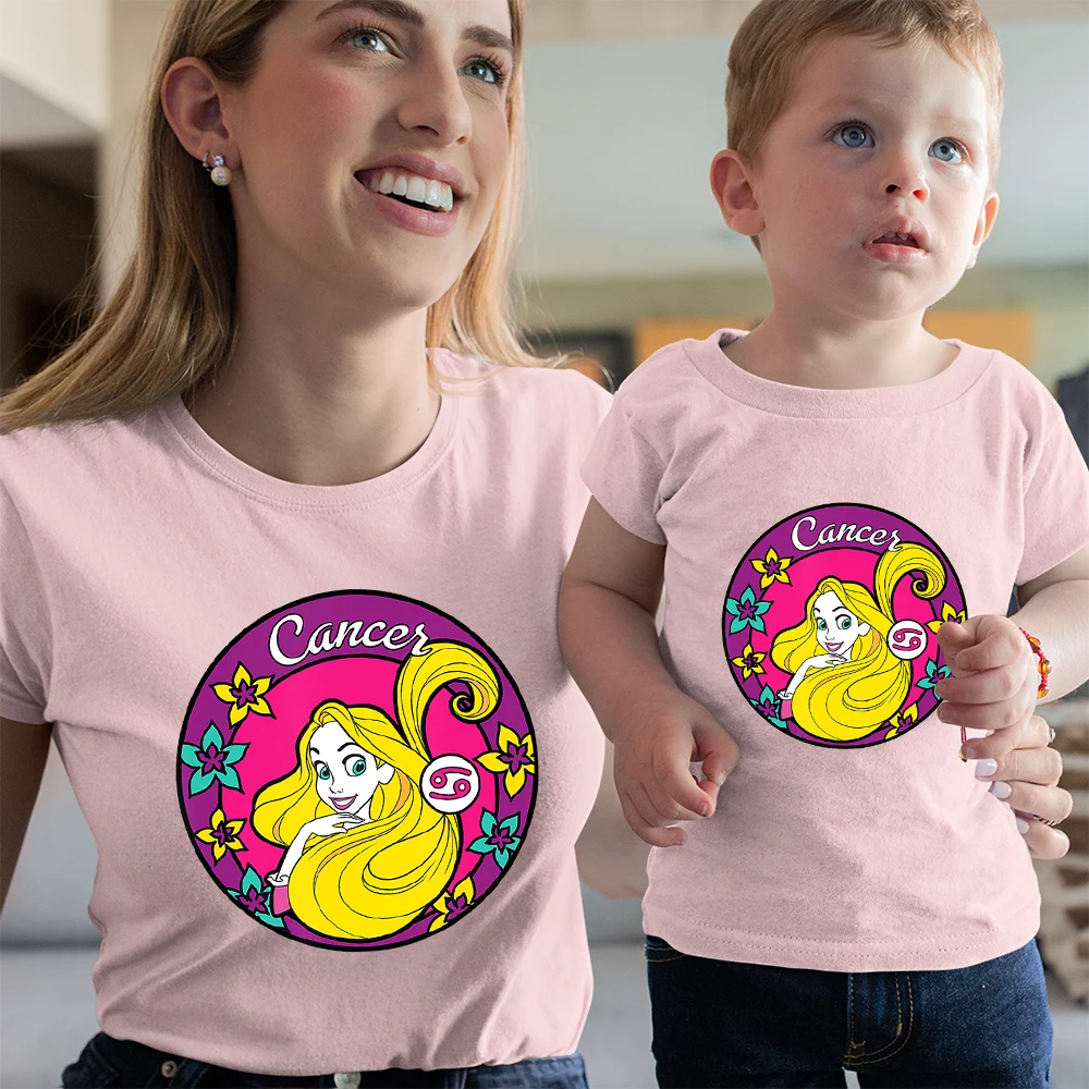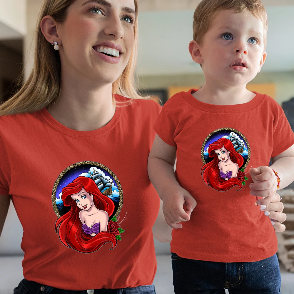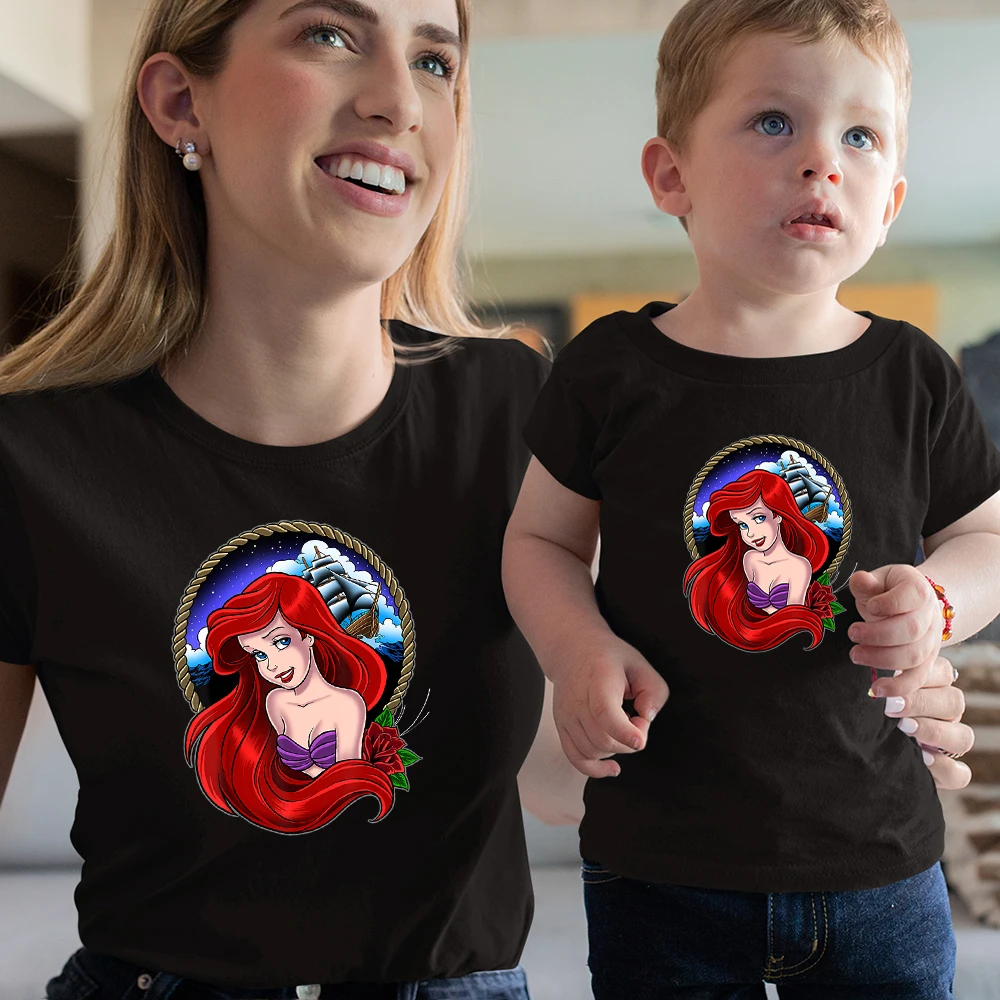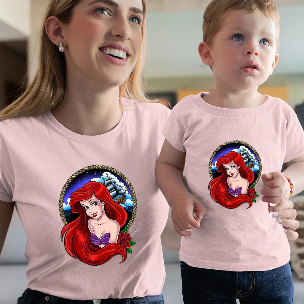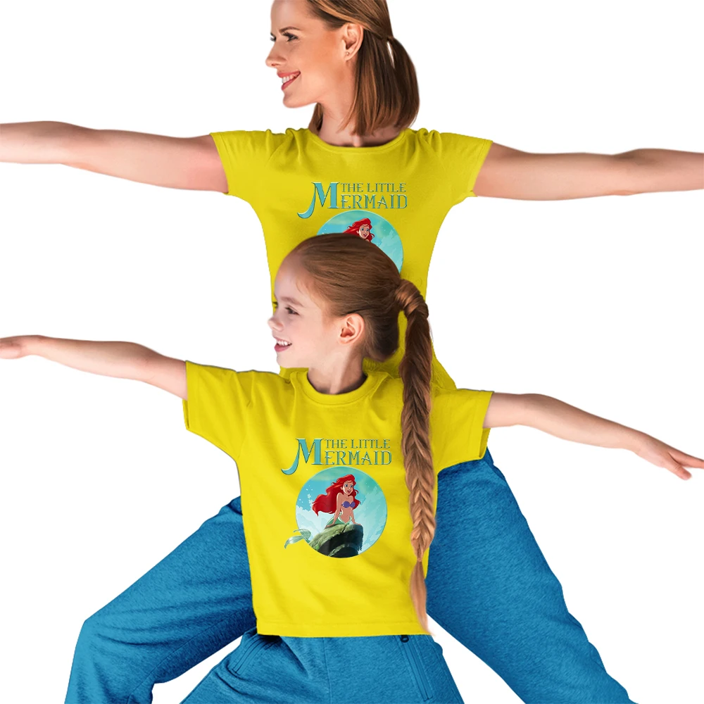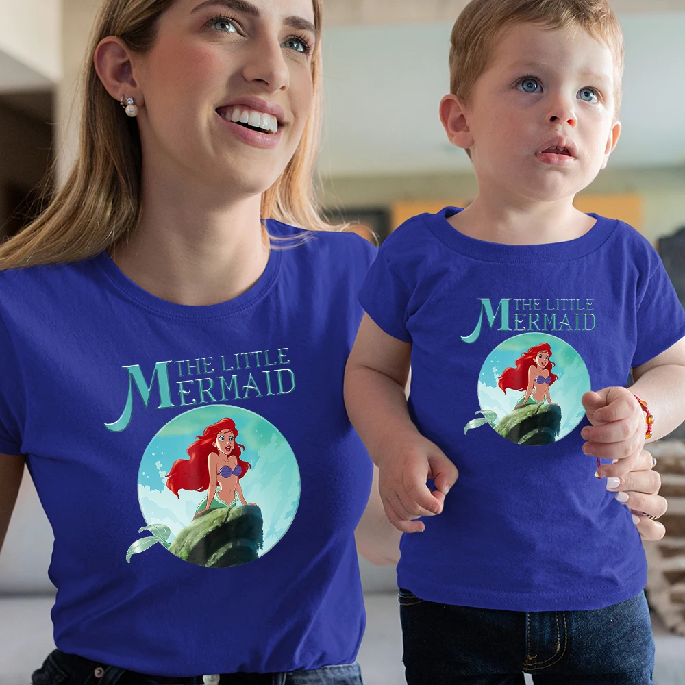 Футболки с изображением Русалочки Ариэль, для мужчин и женщин, для мальчиков и девочек, летние, удобные, одинаковые, для всей семьи, топ с диснеевским принтом