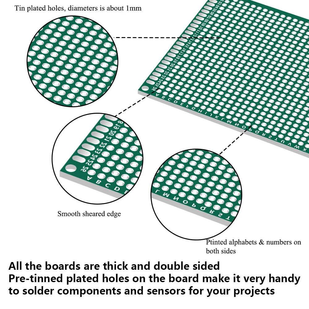 Особенности продукта Качественный материал: эти макетные платы изготовлены из высококачественного FR-4 Толстого и прочного стекловолокна и не плавятся при припое. Сверху и снизу одинаковые медные слои Прочный и простой в использовании: Все доски толстые и двухсторонние. Покрытые отверстия луженые и очень твердые, что делает его очень легким для припоя компонентов Описание товара Спецификация: Материал: двухсторонняя медная печатная плата 4 разных размера: 3x 7/ 4x 6/ 5x 7/ 7x9 см Толщина: 1,6 мм Отверстие-зазор: 2,54 мм Диаметр отверстия: 1 мм Диаметр монтажного отверстия: 2 мм Посылка включает: 1 шт. 3x7 см Прототип PCB универсальная плата 1 шт. 4x6 см Прототип PCB универсальная плата 1 шт. 5x7 см Прототип PCB универсальная плата 1 шт. 7x9 см Прототип PCB универсальная плата Всего 4 шт. Примечание: после завершения пайки лучше всего отложить на некоторое время, чтобы остыть, чтобы не допустить сжигания пальцев.