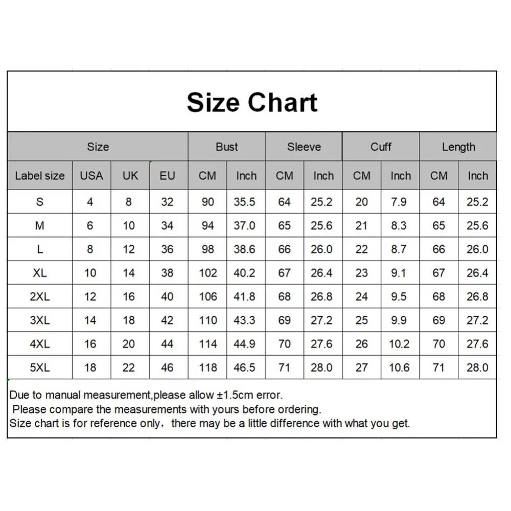 [Наш Размер S] Бюст: 90 см/35,43 дюйма, рукав: 64 см/25,20 дюйма, Манжеты: 20 см/7,87 дюйма, длина: 64 см/25,20 дюйма (прибл.)[Наш Размер M] Бюст: 94 см/37,01 дюйма, рукав: 65 см/25,59 дюйма, Манжеты: 21 см/8,27 дюйма, длина: 65 см/25,59 дюйма (прибл.)[Наш Размер L] Бюст: 98 см/38,58 дюйма, рукав: 66 см/25,98 дюйма, манжеты: 22 см/8,66 дюйма, длина: 66 см/25,98 дюйма (прибл.)[Наш Размер XL] Бюст: 102 см/40,16 дюйма, рукав: 67 см/26,38 дюйма, Манжеты: 23 см/9,06 дюйма, длина: 67 см/26,38 дюйма (прибл.)[Наш Размер 2XL] Бюст: 106 см/41,73 дюйма, рукав: 68 см/26,77 дюйма, манжеты: 24 см/9,45 дюйма, длина: 68 см/26,77 дюйма (прибл.)[Наш Размер 3XL] Бюст: 110 см/43,31 дюйма, рукав: 69 см/27,17 дюйма, Манжеты: 25 см/9,84 дюйма, длина: 69 см/27,17 дюйма (прибл.)[Наш Размер 4XL] Бюст: 114 см/44,88 дюйма, рукав: 70 см/27,56 дюйма, Манжеты: 26 см/10,24 дюйма, длина: 70 см/27,56 дюйма (прибл.)[Наш Размер 5XL] Бюст: 118 см/46,46 дюйма, рукав: 71 см/27,95 дюйма, Манжеты: 27 см/10,63 дюйма, длина: 71 см/27,95 дюйма (прибл.)
