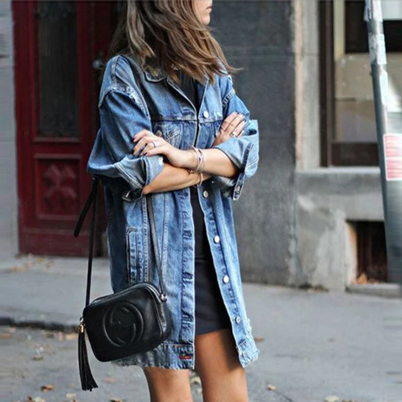 Женская джинсовая куртка средней длины, синяя длинная джинсовая кур...