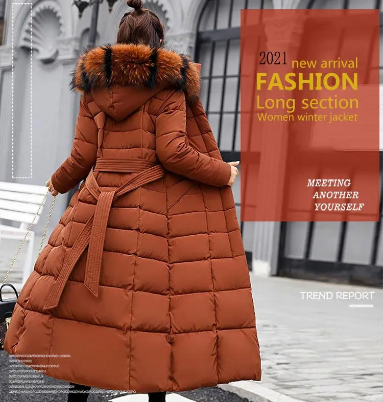 Теплые пуховики, женская зимняя куртка, пуховики, женские парки, длинные, Новое поступление 2021, меховой воротник, капюшон, молния, ремень