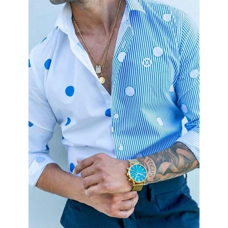 Мужская приталенная рубашка в горошек, голубая Повседневная рубашка в полоску, с длинными рукавами, на пуговицах, с лацканами, в европейском и американском стиле, осень 2021