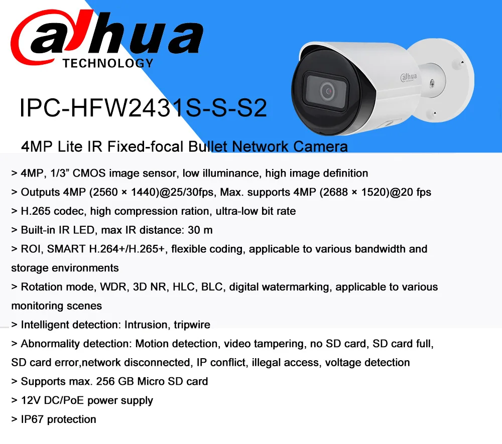 Оригинальная 4-мегапиксельная IP-камера Dahua, IPC-HFW2431S-S-S2 Po...